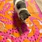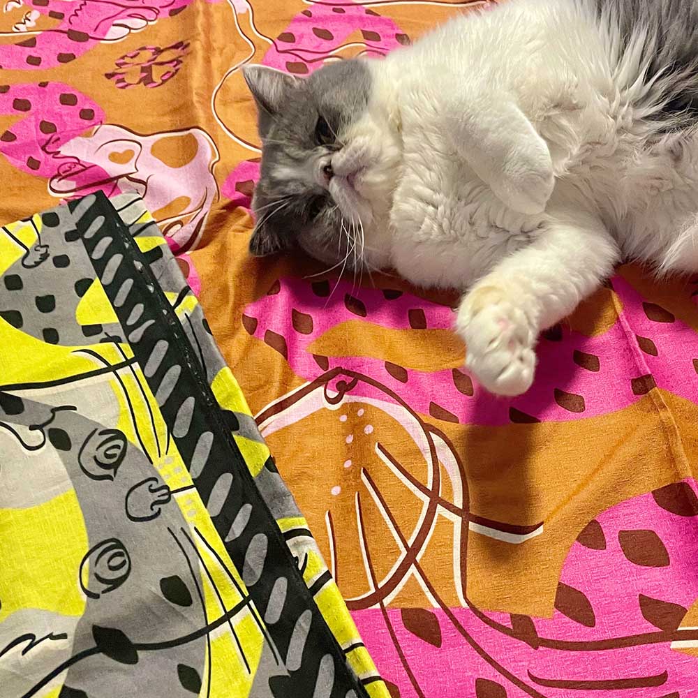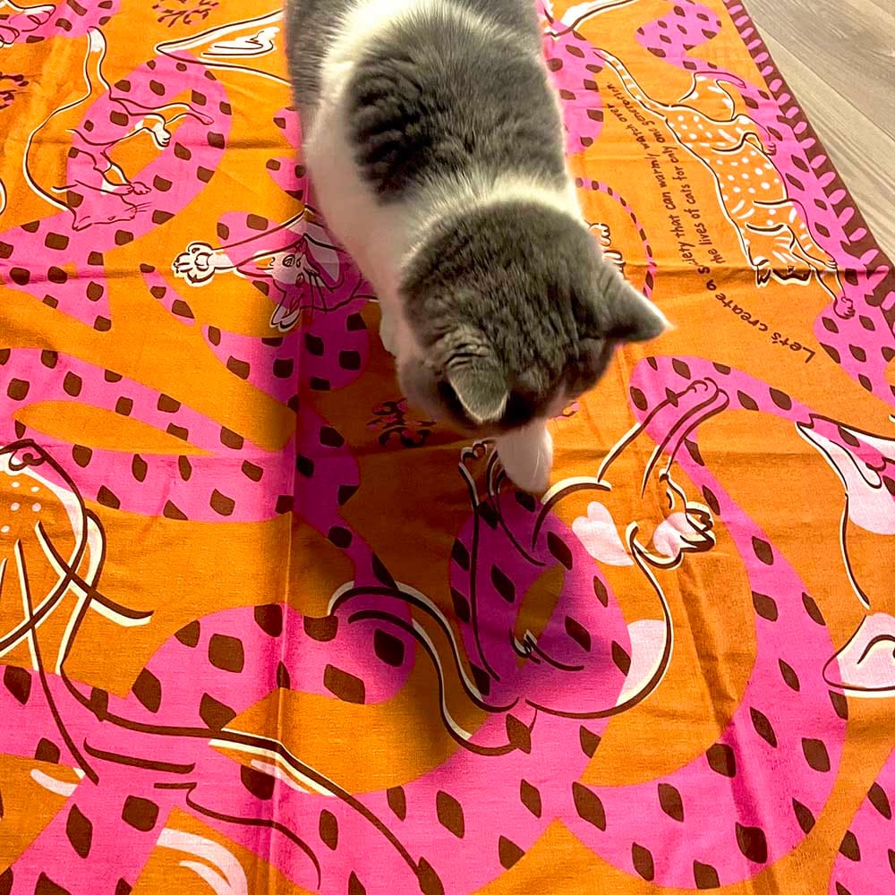 「ヒョウ柄」っぽい色目なのに「猫柄」のところが気に入った。かなり大判だが、使いみちの工夫がいろいろできそうで楽しみだ!