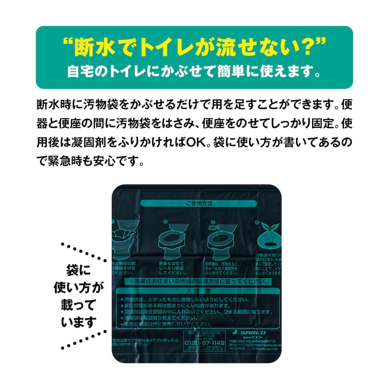 断水でトイレが使えない時のために常備しておくのがおすすめ。