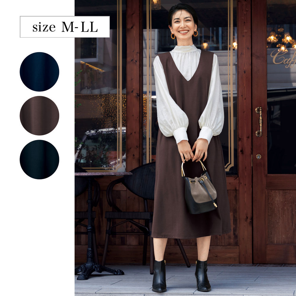 胸のあたりはゆったりしているので着替えるのに楽です。 シルエットはすっきりしていて、中に着るブラウスやニットによっては かしこまった宴会などにもステキに着こなせると思います。 少しゆったりめではあるので、MかLで迷われてい方はMをお勧めします。 身長は155センチですが丈もちょうどよかったです。 ジャンパースカート好きな人でしたら気に入ると思います。