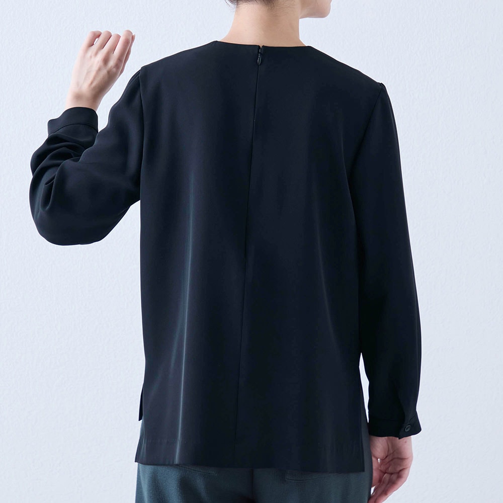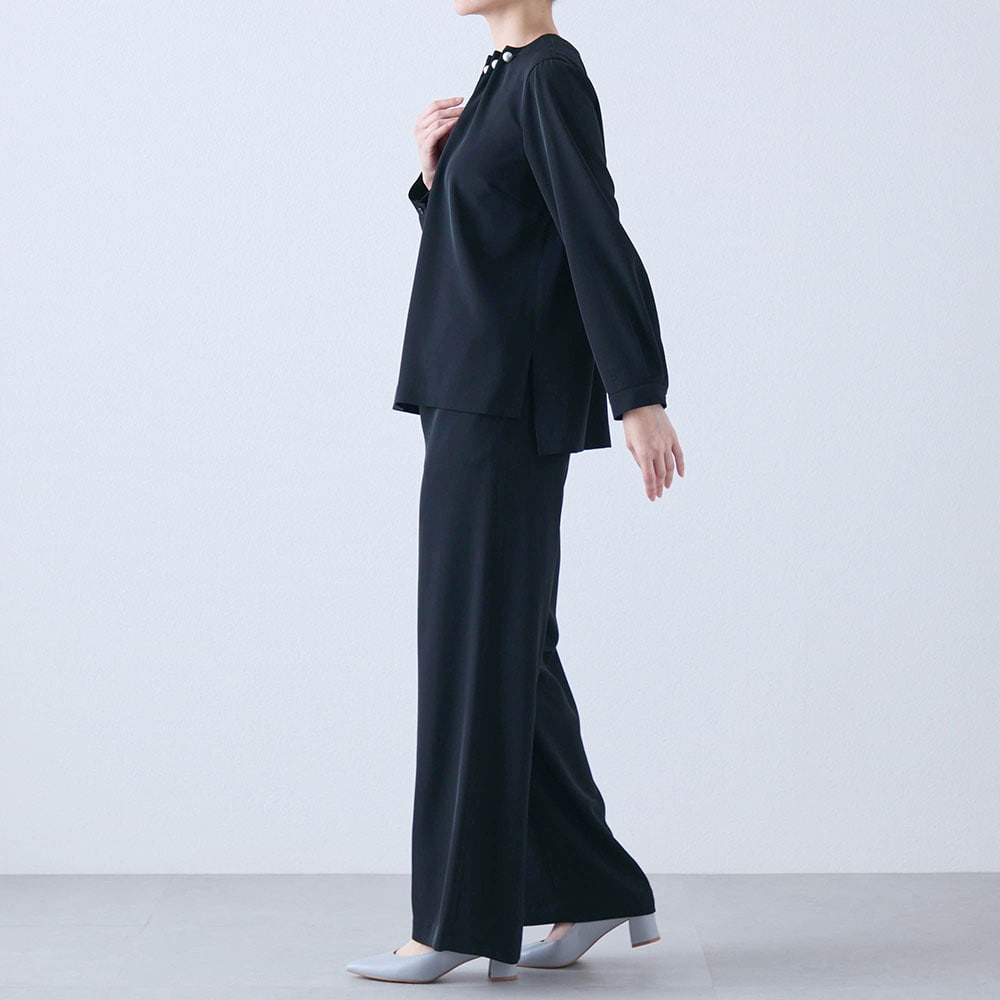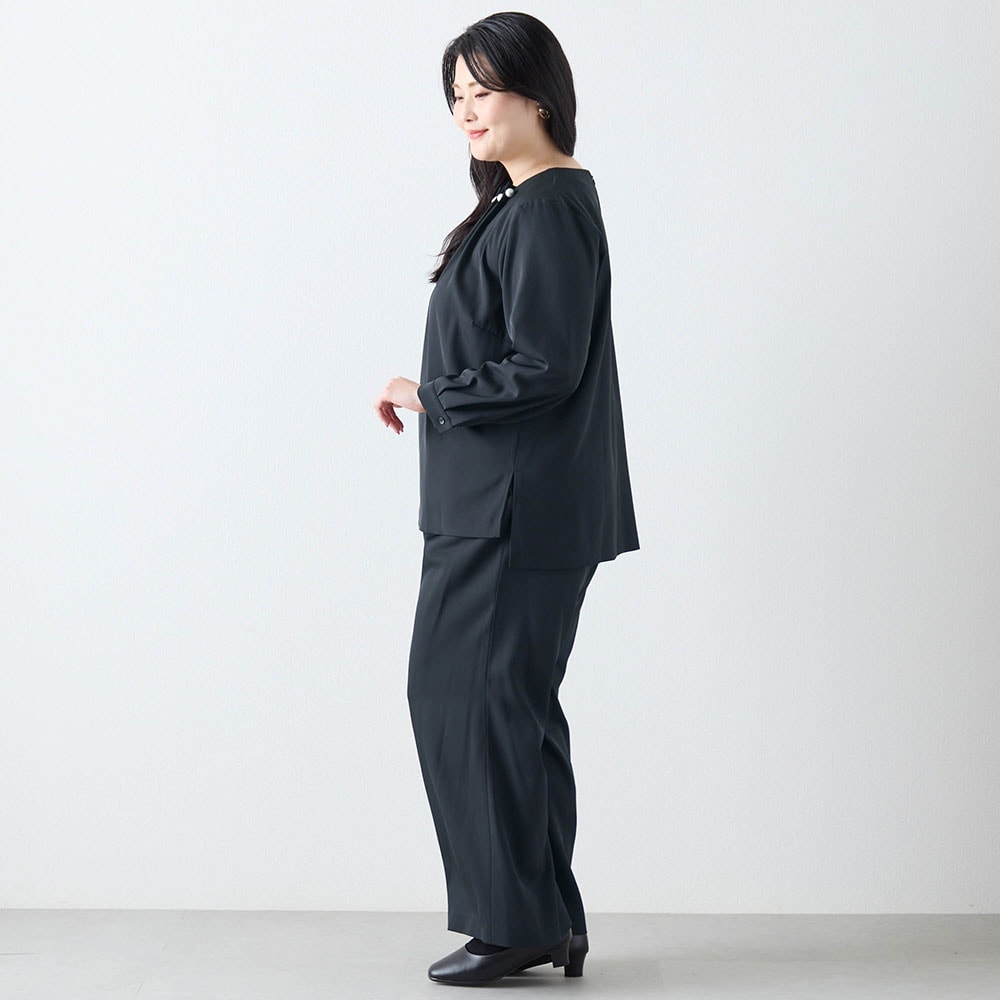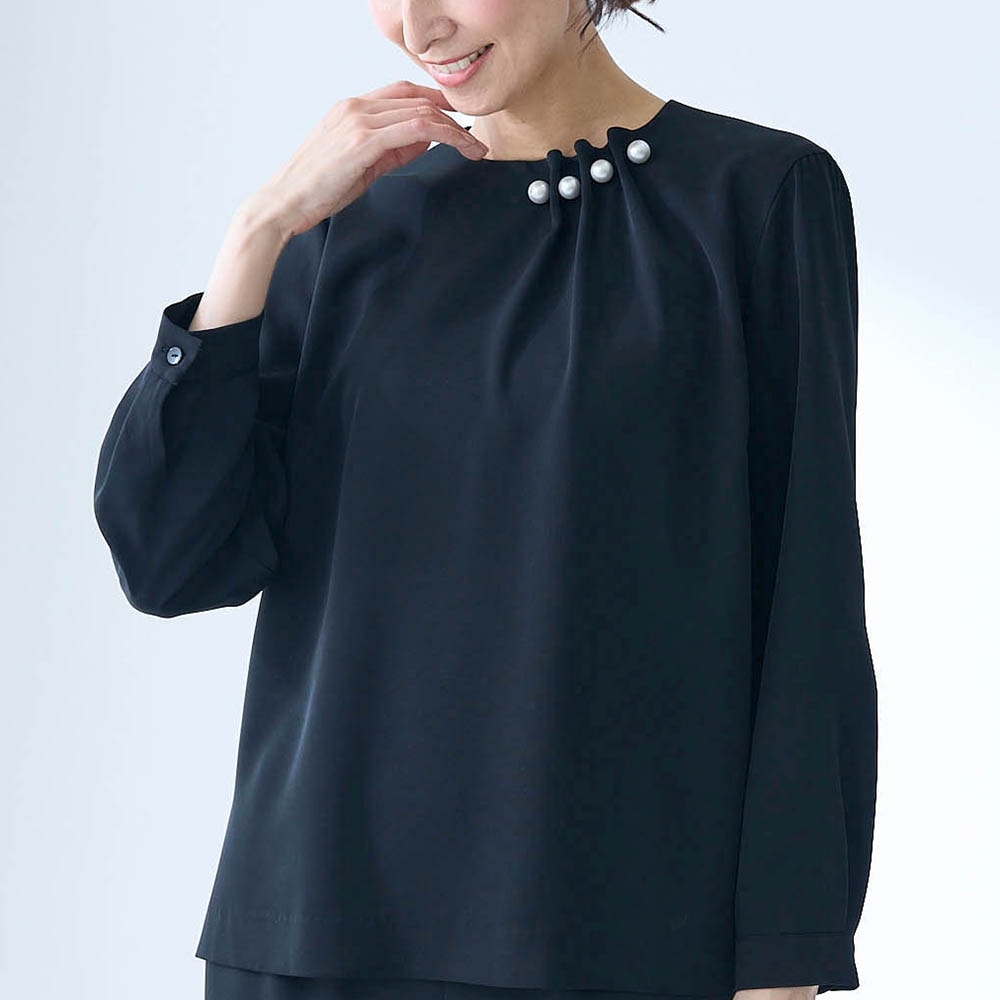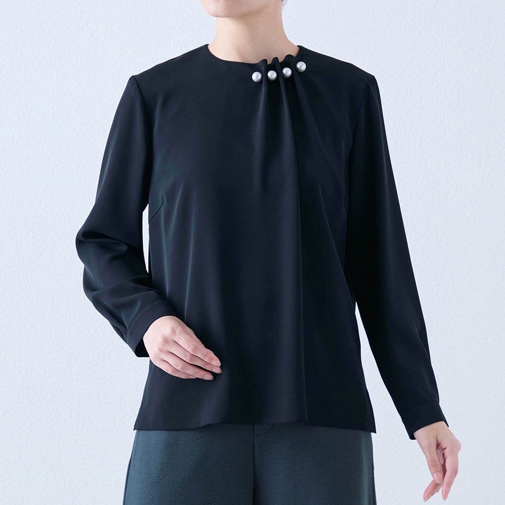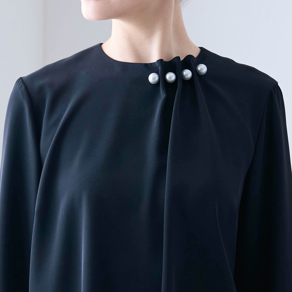 • 襟元にはパール調の大きめボタン付きでアクセサリー無しでもOK