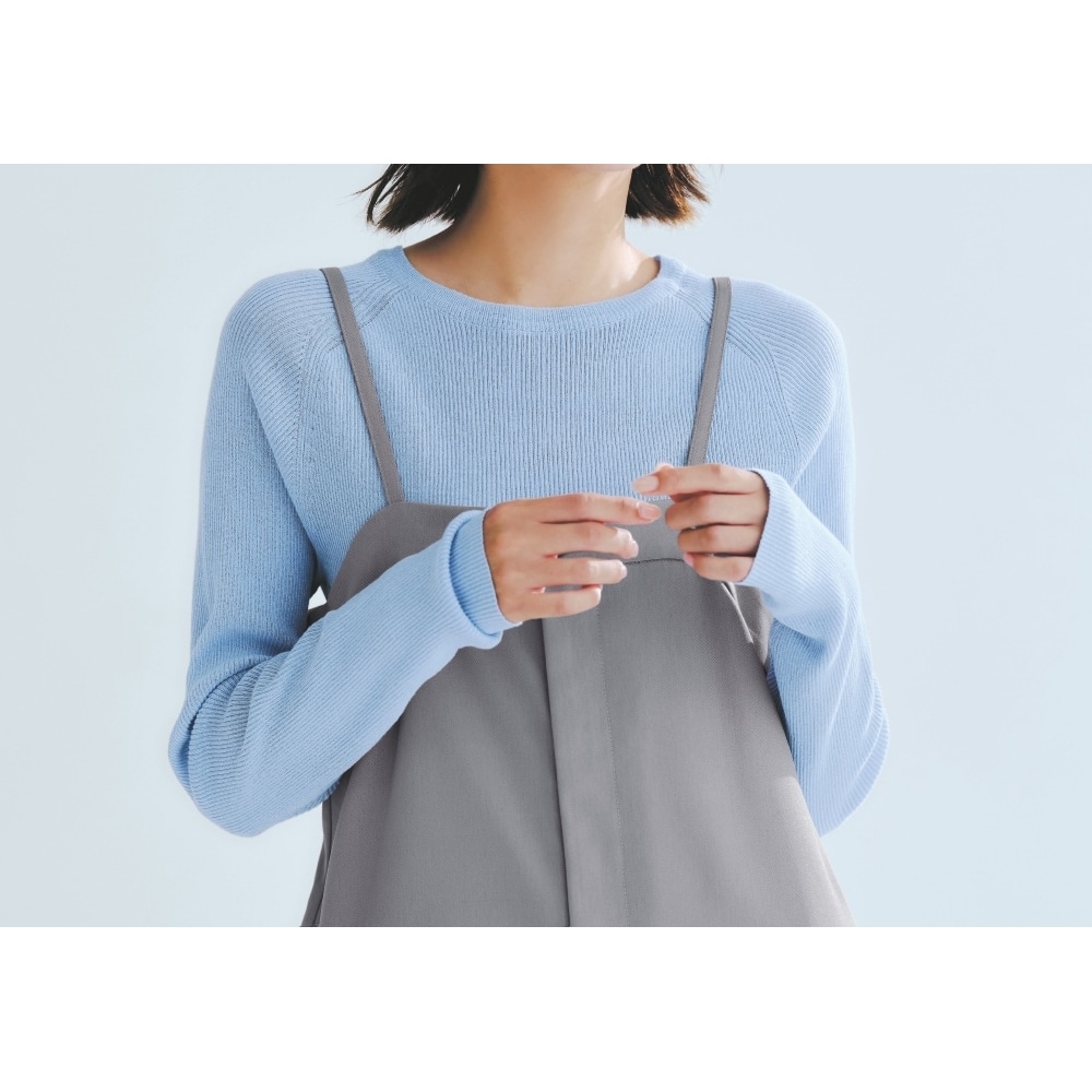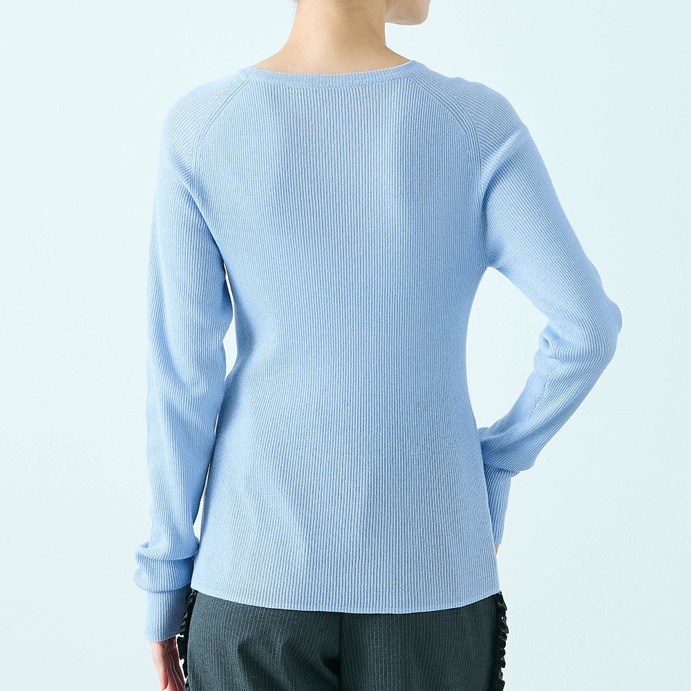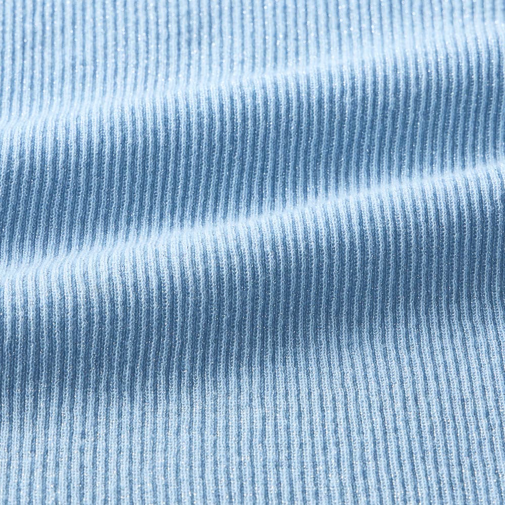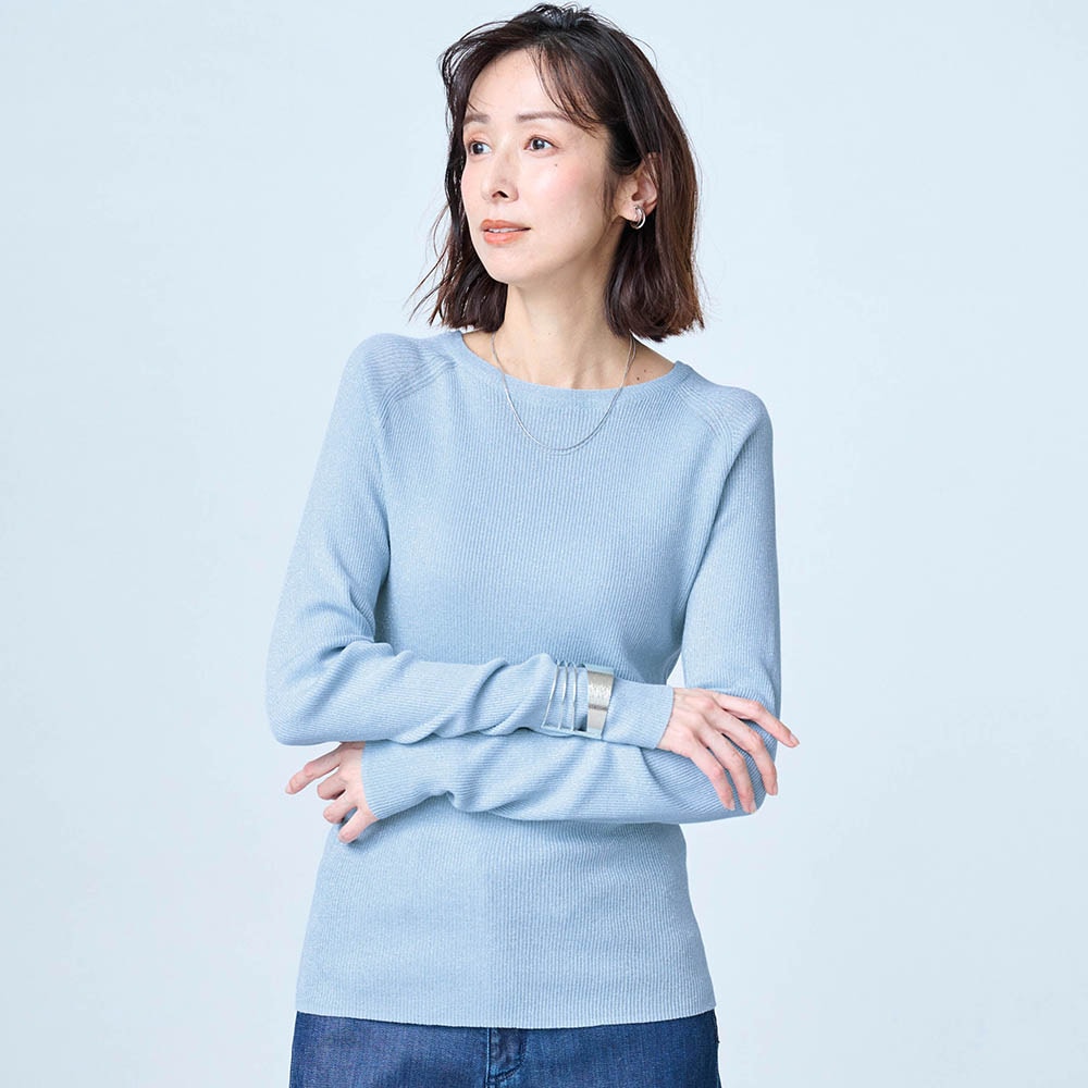カラーは素敵な水色です。ラメの感じも派手過ぎずとても良い感じです。でも着心地が最悪です。袖も見頃も着ていると上に上がってきて、首元に集まってきて詰まった感じになります。だからいつも袖と見頃を引っ張って着ていなくてはなりません。私が小さいせいでしょうか?後袖が長過ぎて袖口でクシュッとさせてとはありますがモデルさんの様にはカッコ良くはなりません。