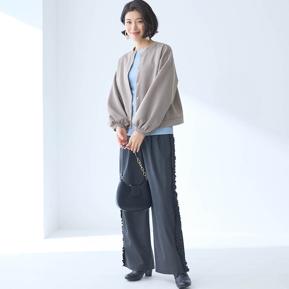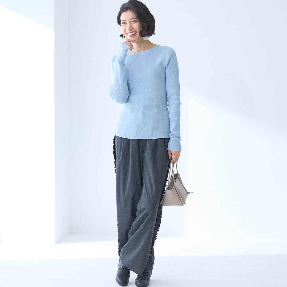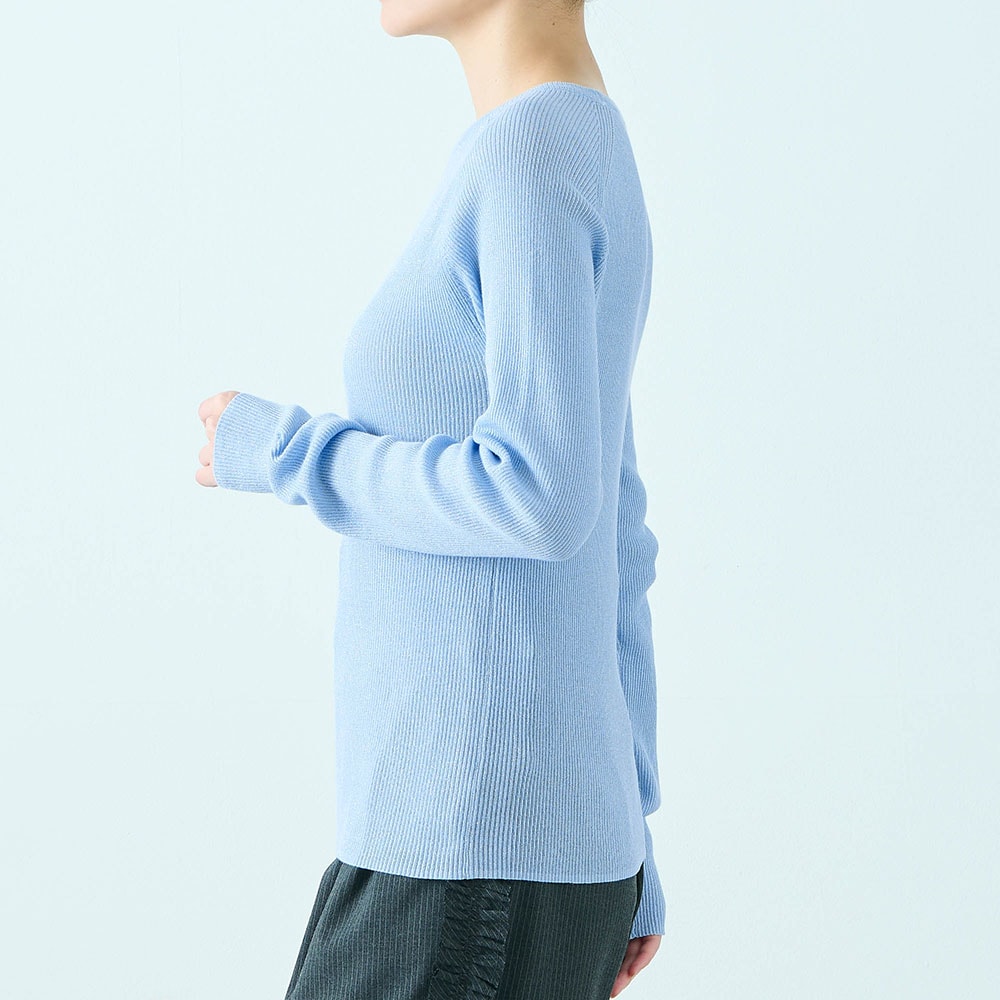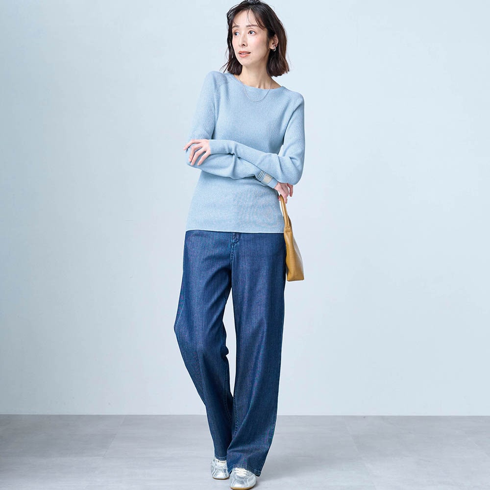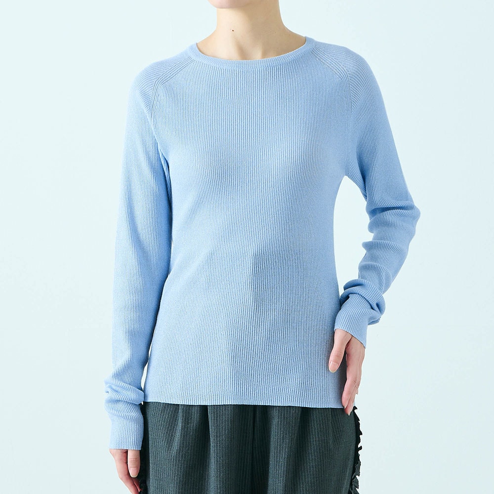 カラーは素敵な水色です。ラメの感じも派手過ぎずとても良い感じです。でも着心地が最悪です。袖も見頃も着ていると上に上がってきて、首元に集まってきて詰まった感じになります。だからいつも袖と見頃を引っ張って着ていなくてはなりません。私が小さいせいでしょうか?後袖が長過ぎて袖口でクシュッとさせてとはありますがモデルさんの様にはカッコ良くはなりません。
