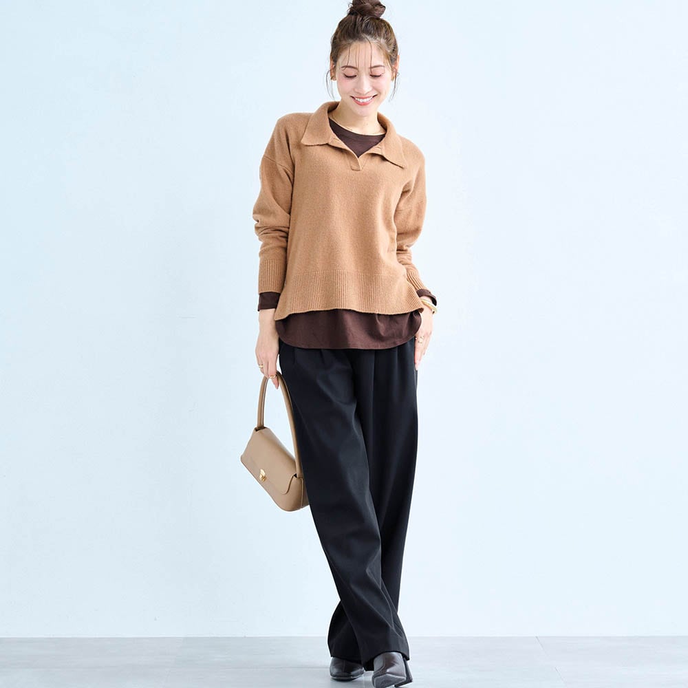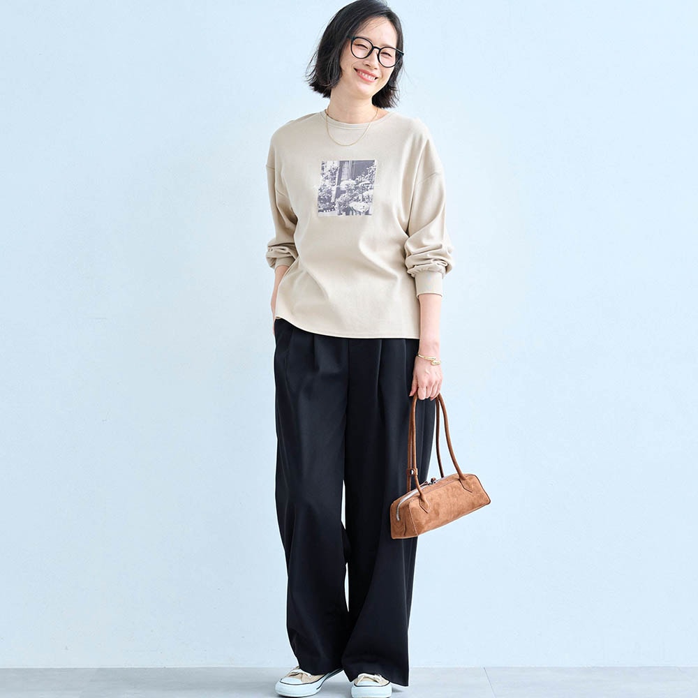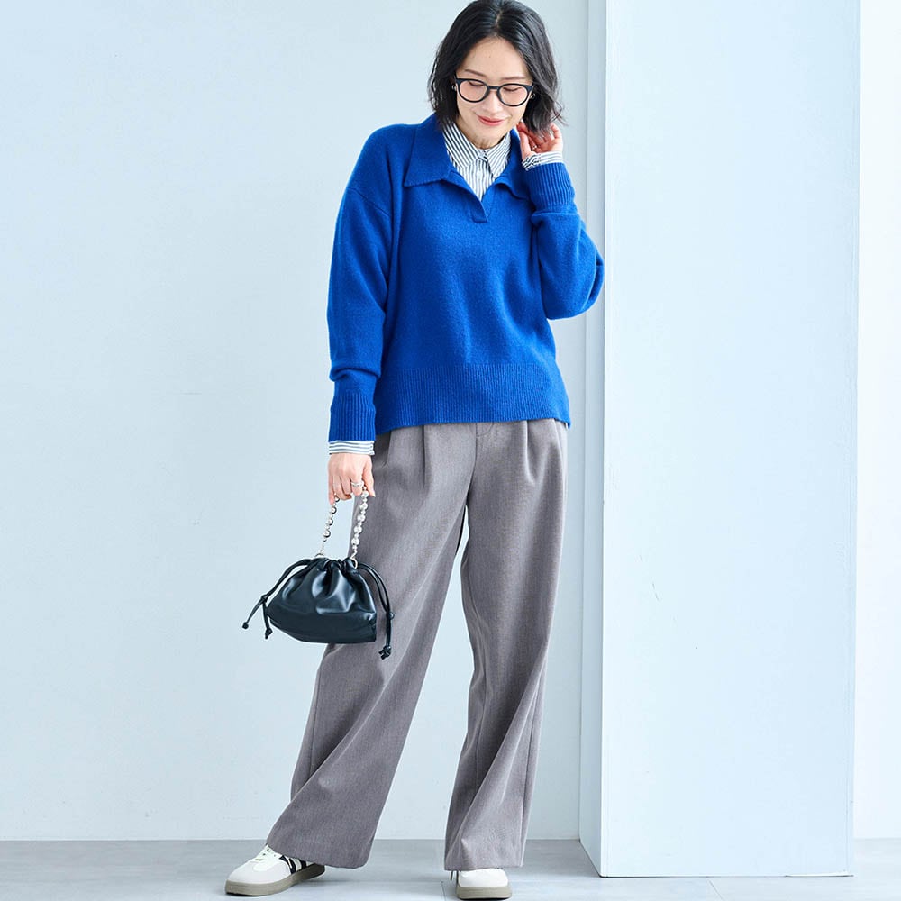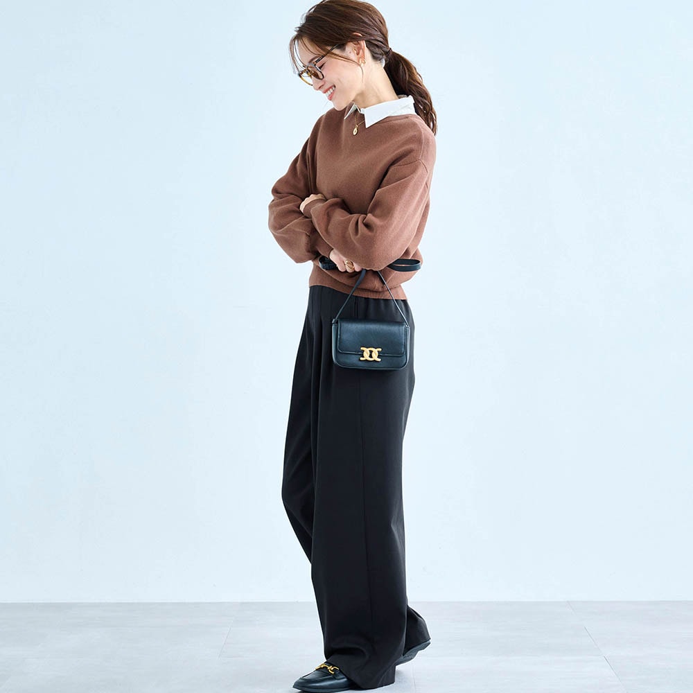 ・程よいワイドシルエットとやや前振りの脇線が、脚をすっきり見せ