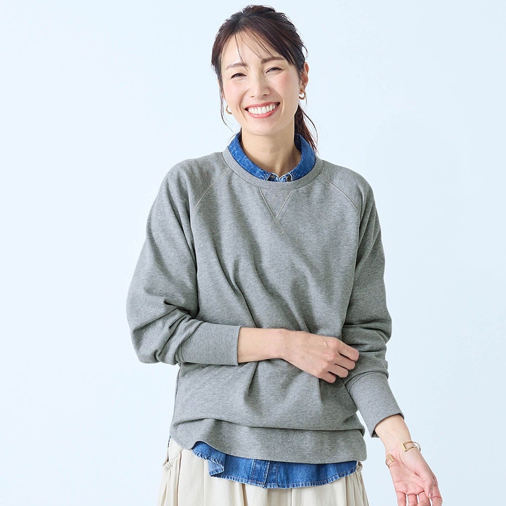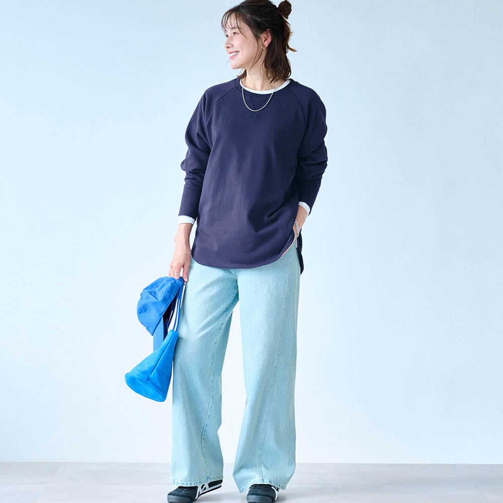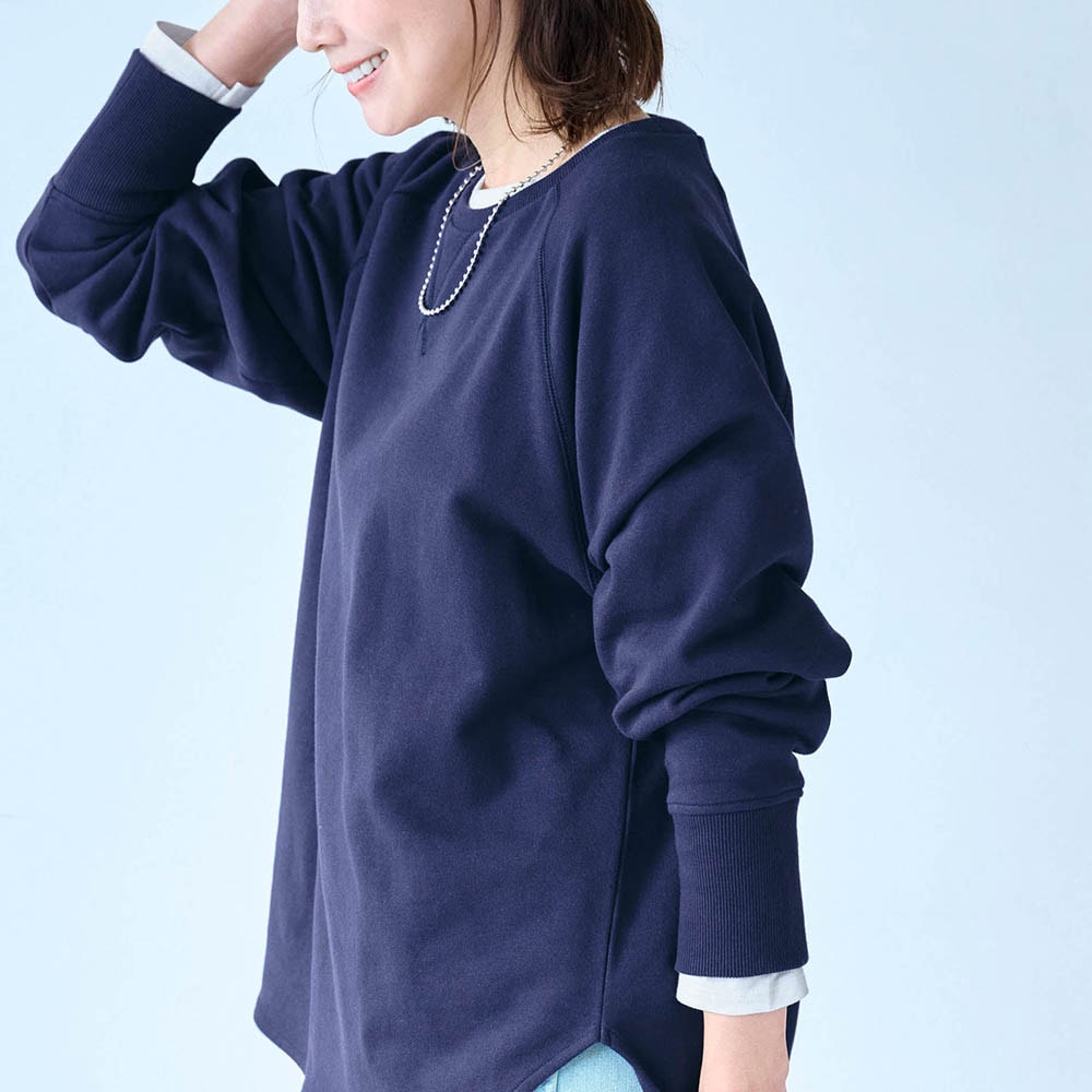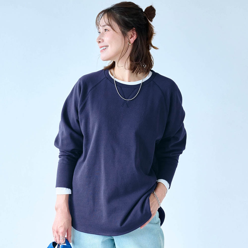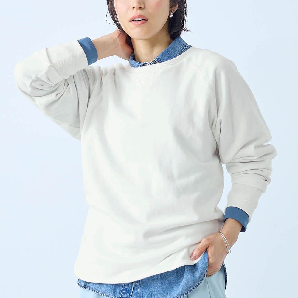 しっかりした綿生地ですが、スウェットとしては少し薄手でした。でも1枚で着てもインナーっぽくならず、いろんなボトムスと合わせられます。