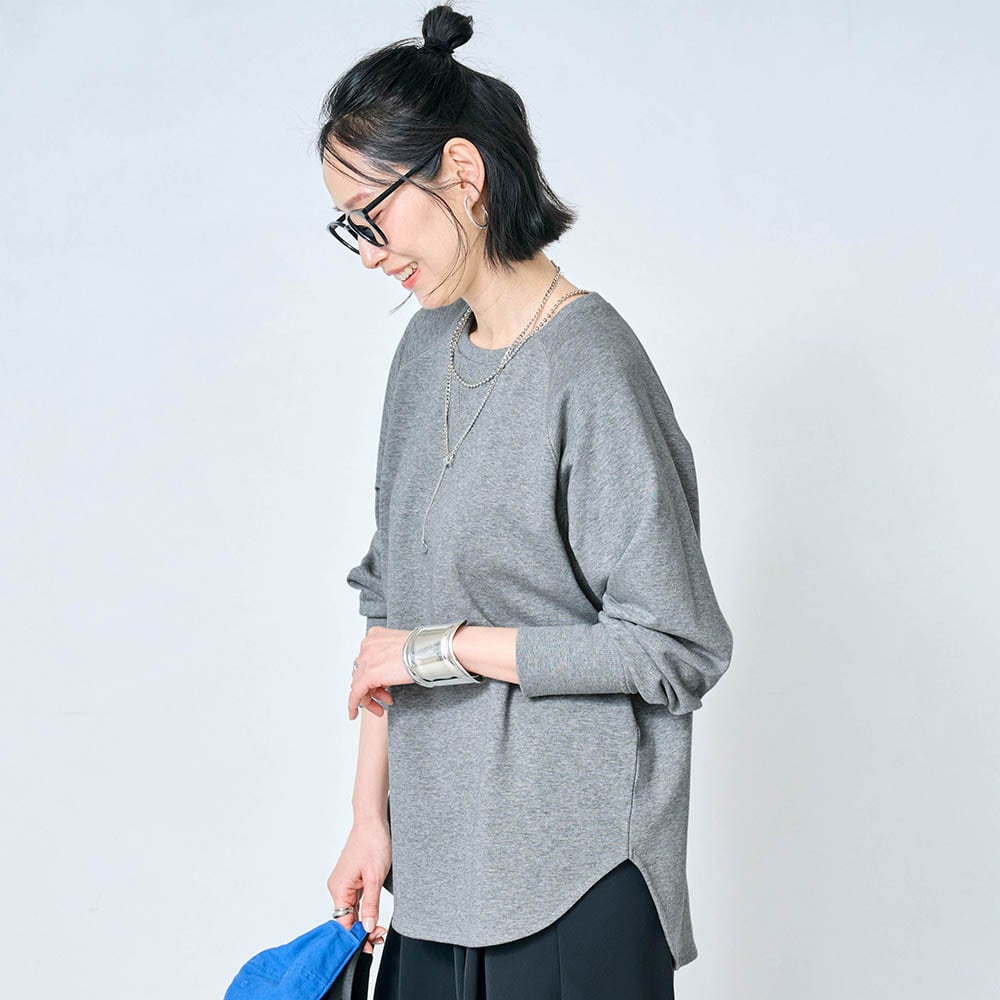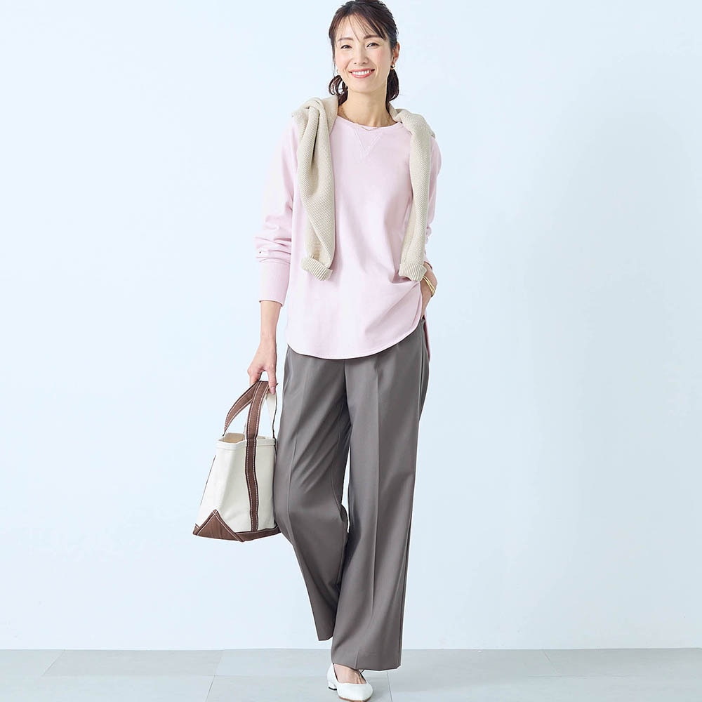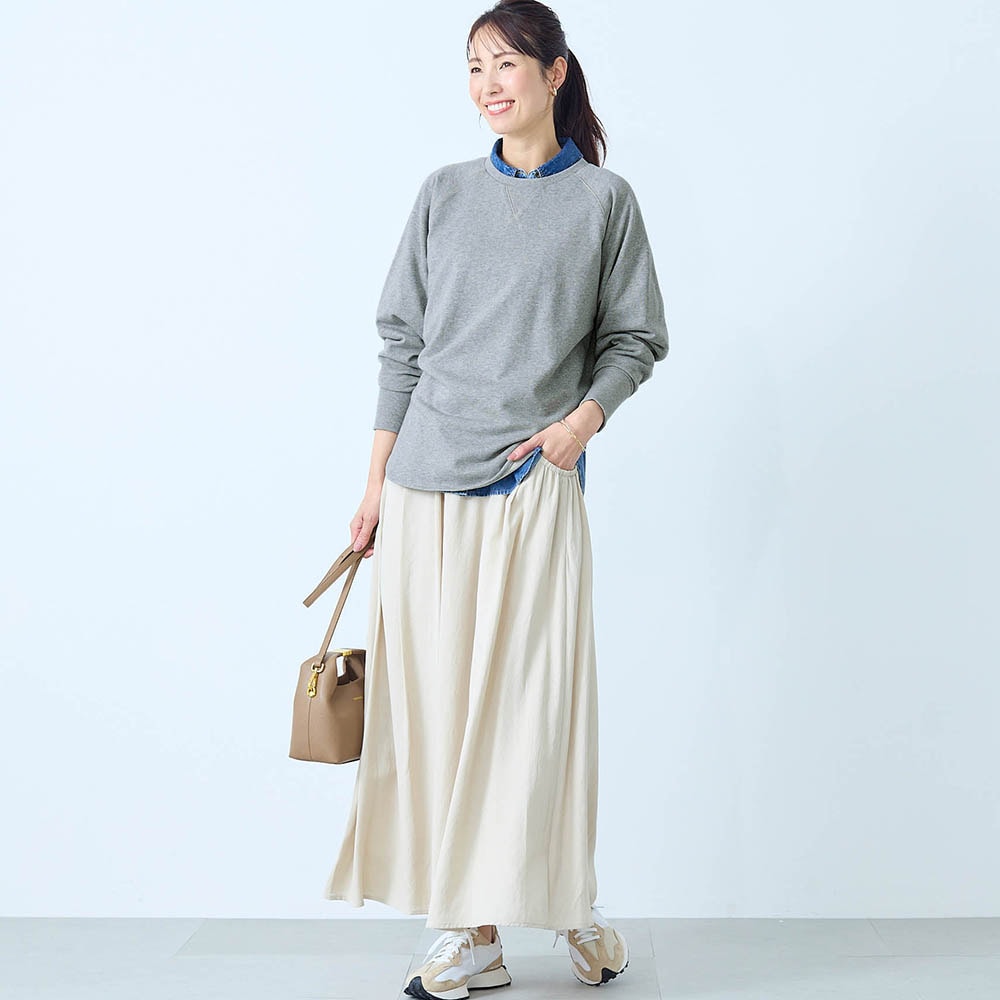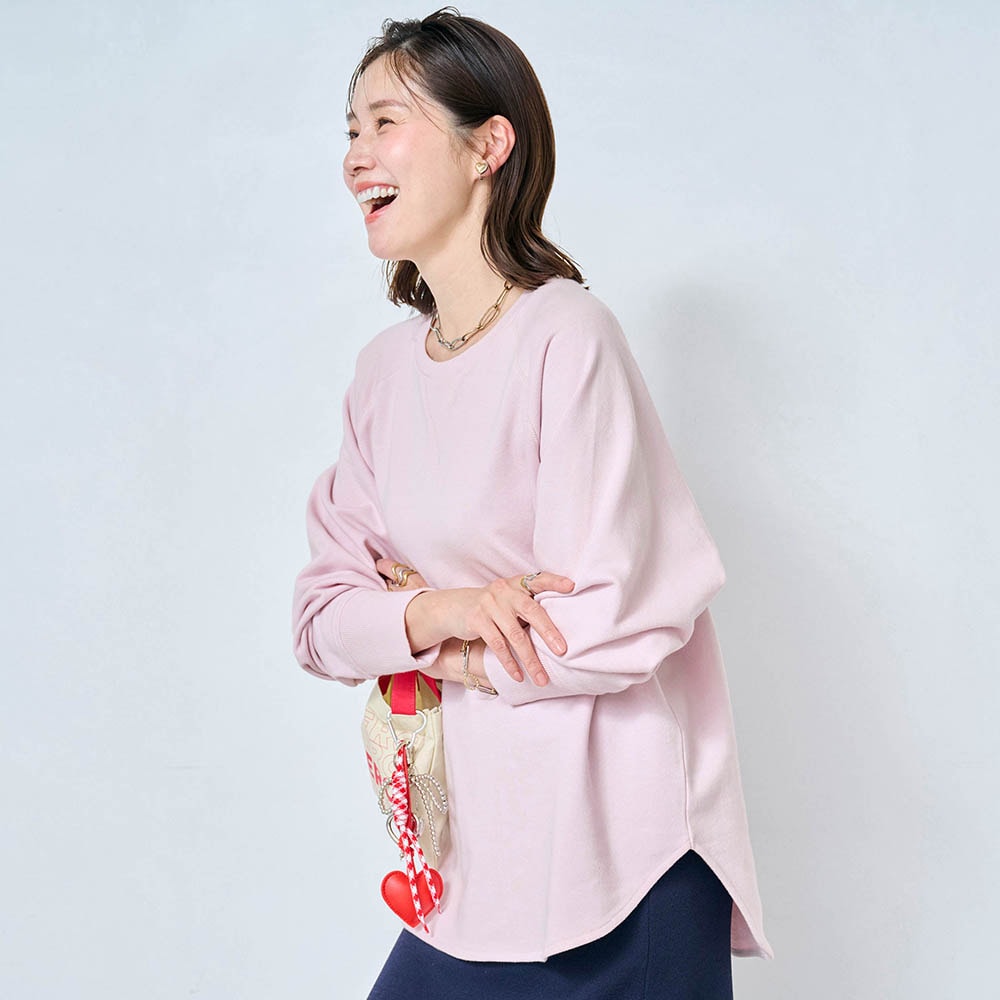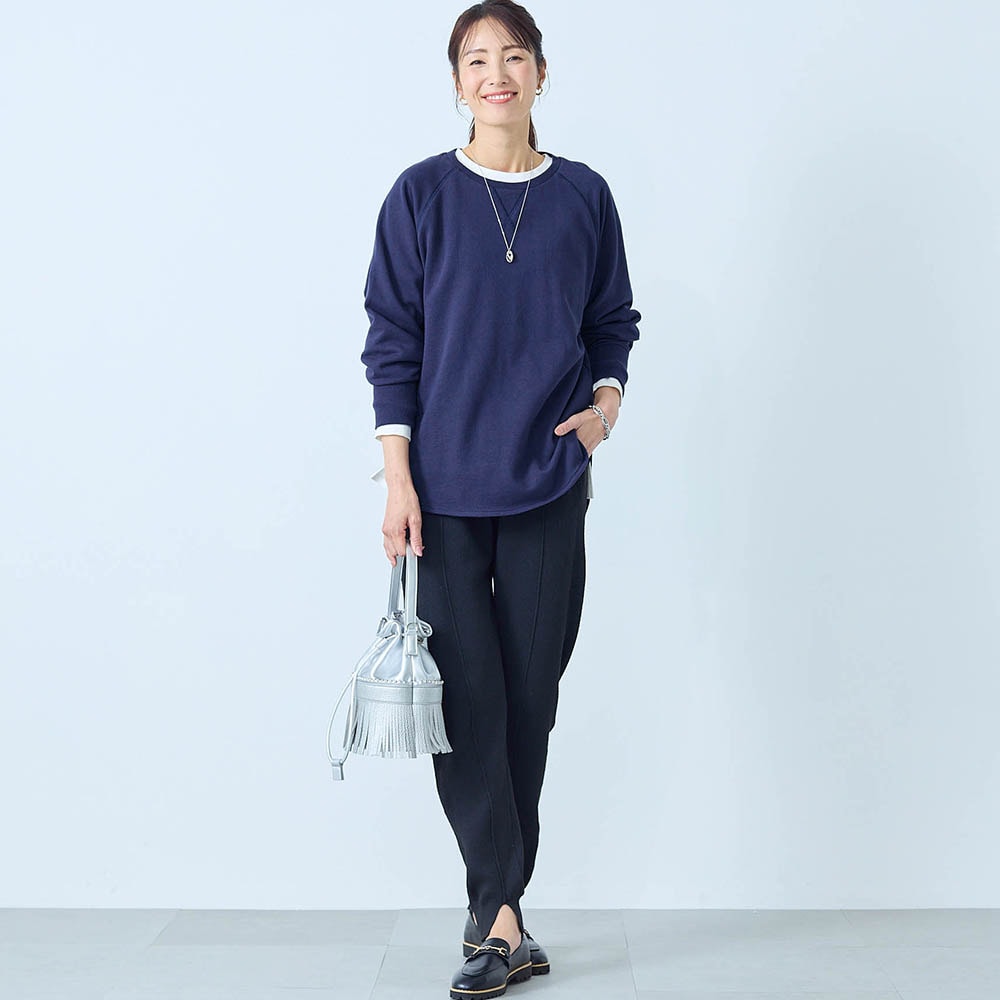 しっかりした綿生地ですが、スウェットとしては少し薄手でした。でも1枚で着てもインナーっぽくならず、いろんなボトムスと合わせられます。