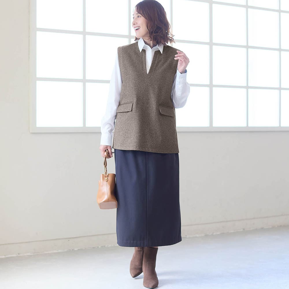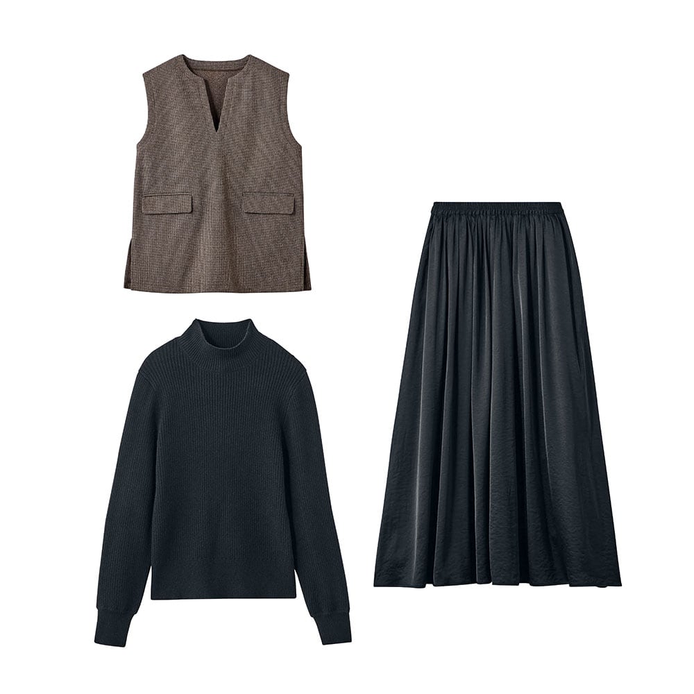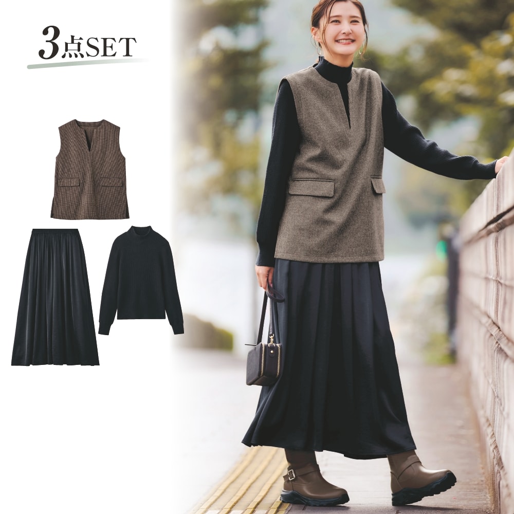 この3点セットは、毎年買っているアイテムなのですが、今までのスカートとは全く素材が違っていて驚きました。ちょっと苦手なスカート生地です。他のベスト&ニットには満足しています。