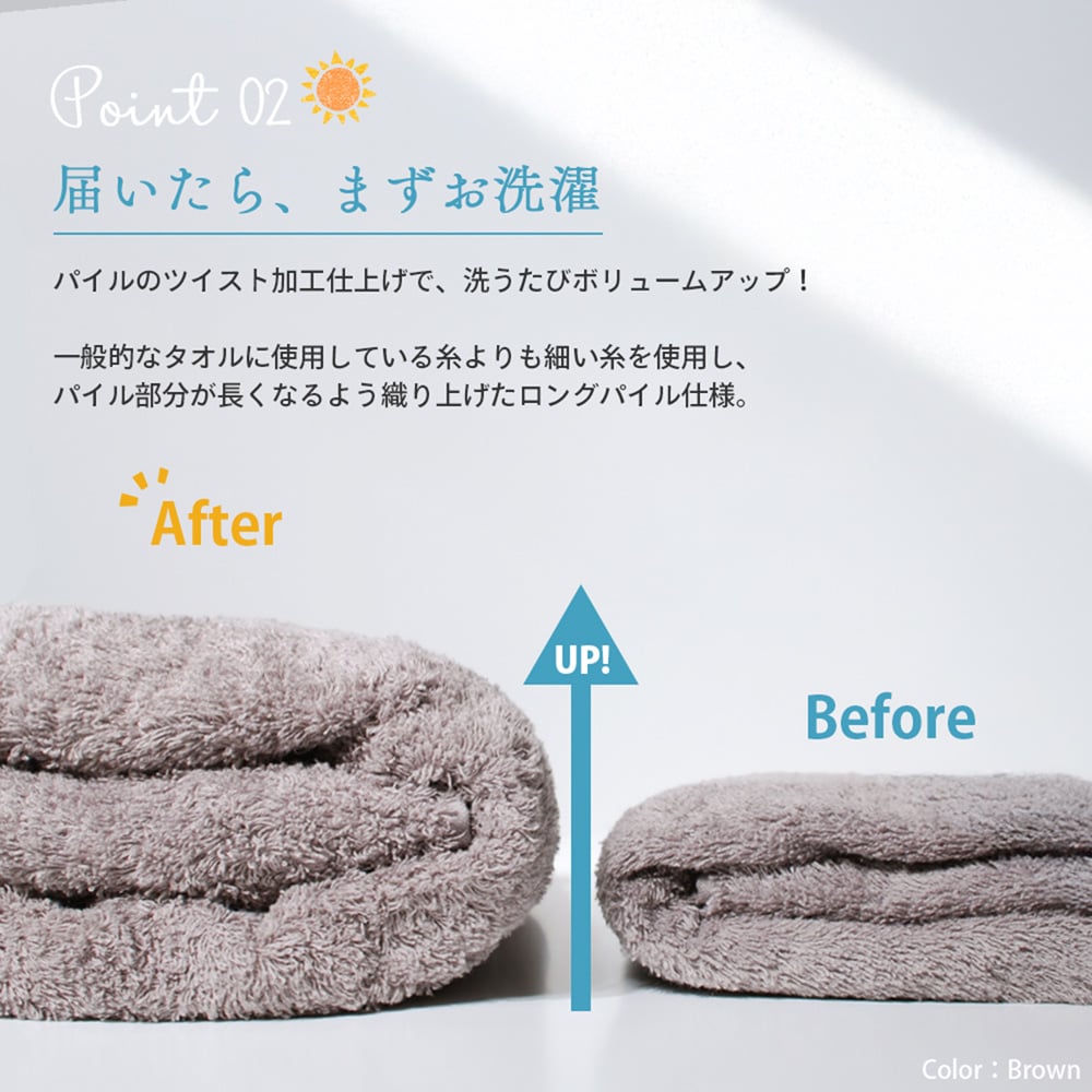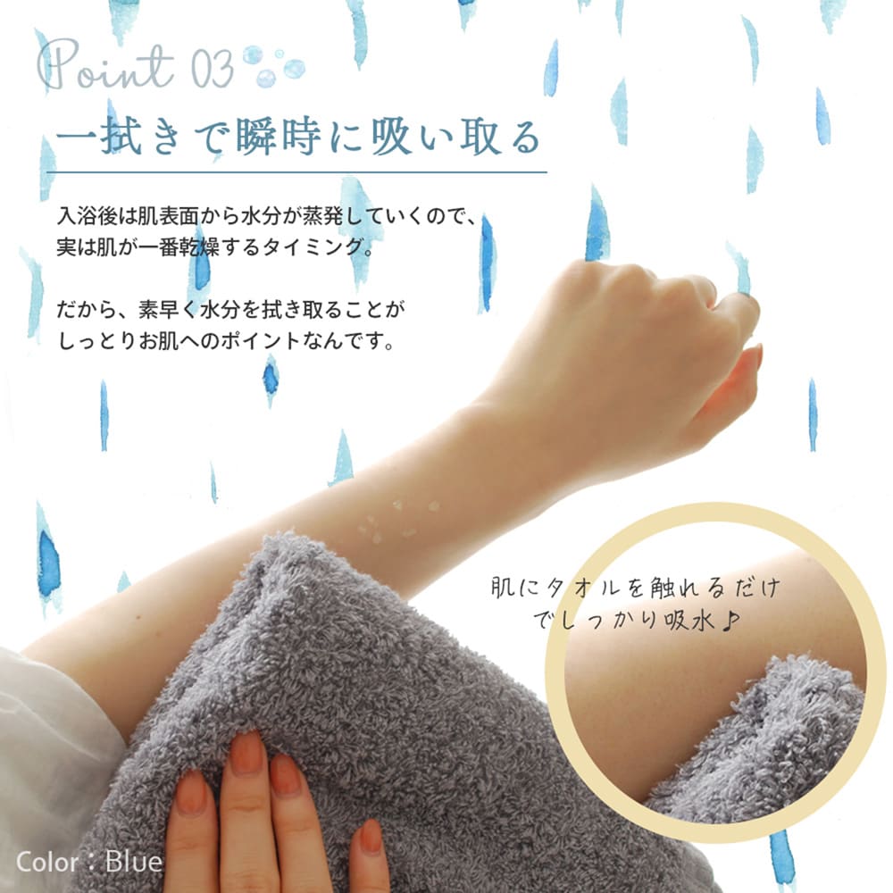 毛足が長くてふわふわで水分を一瞬で吸い取ってくれます。キャンペーンでお得に購入出来たので嬉しいです。タオルは消耗品なので次もこれにしたいです。