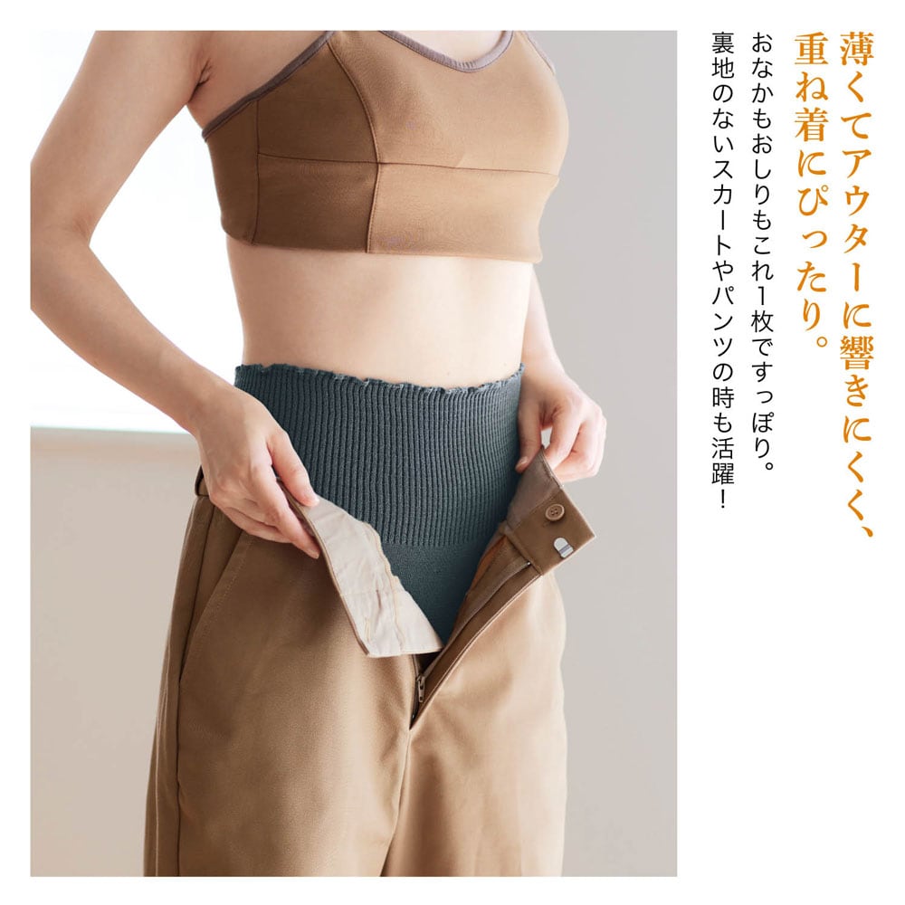 そのため、腹巻きとショーツを組み合わせたときのように、すき間ができたり、腹巻きのすそがめくれて背中が見えたりすることがなく、きちんと温めてくれます。