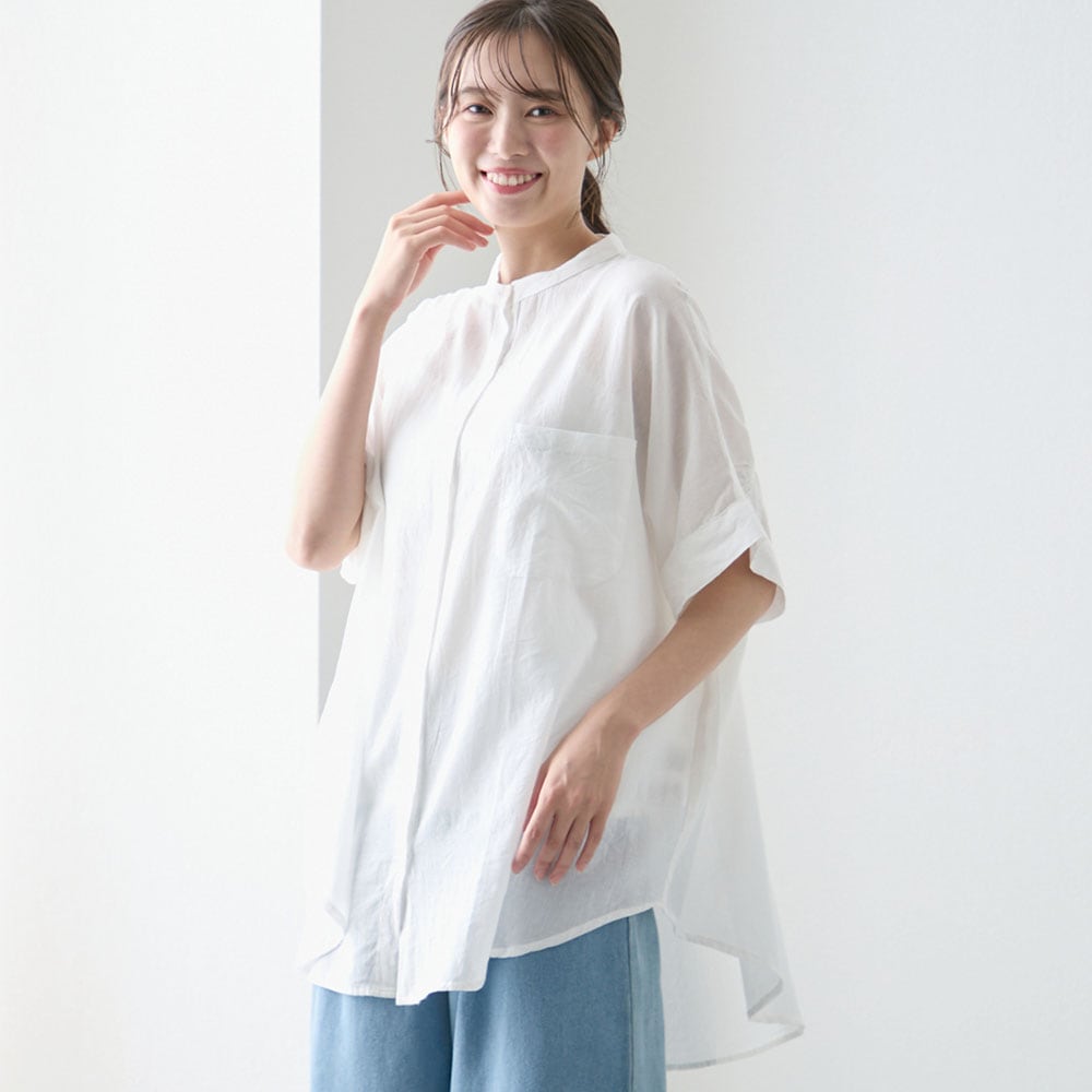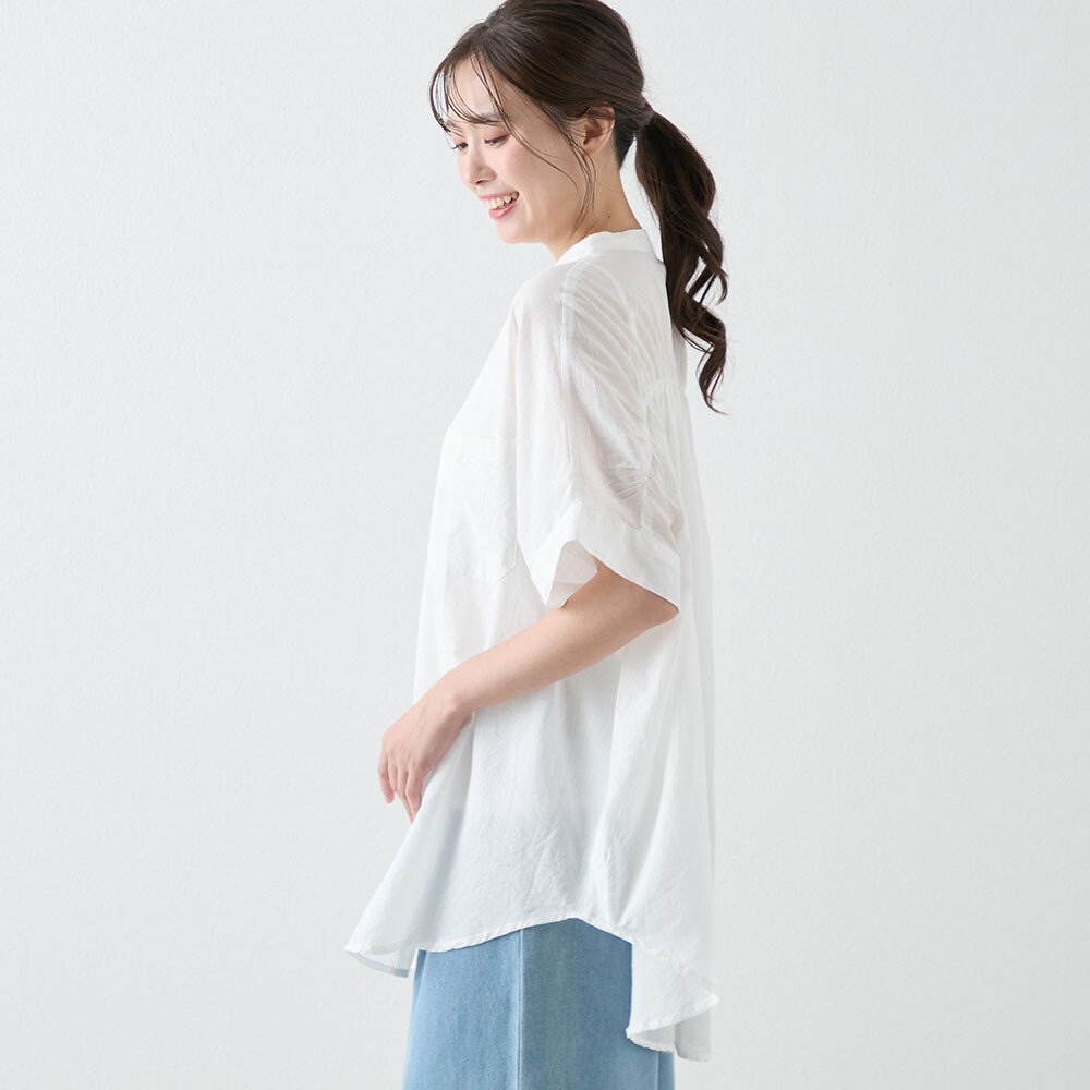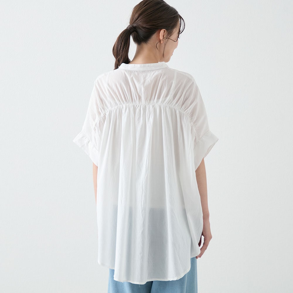 ゆったりサイズでほのかな透け感もあり、後ろギャザーがとても可愛く、ただ私の身長では丈が長いかもと心配でしたが全然大丈夫だった。細身のパンツをはいてもおしりや太もも気にならないし買って正解!だったんですが、後ろギャザーはゴムだったら最高でした。前屈みでとっさに両手を前に動かすとピリッと(涙)