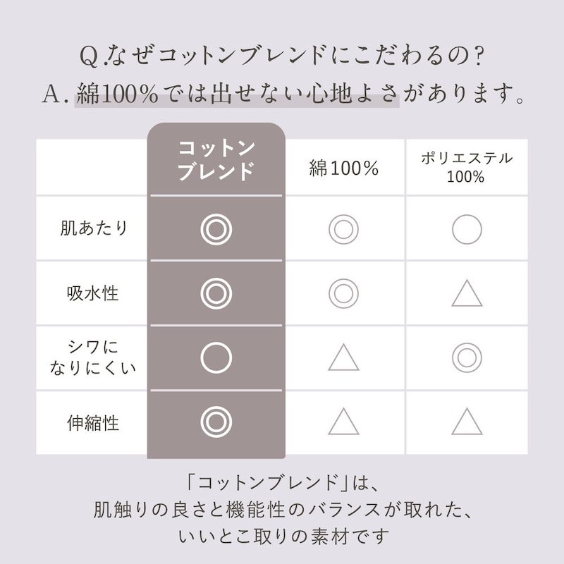 コットンブレンドは、肌触りのよさと機能性のバランスが取れた、いいとこどりの素材です。