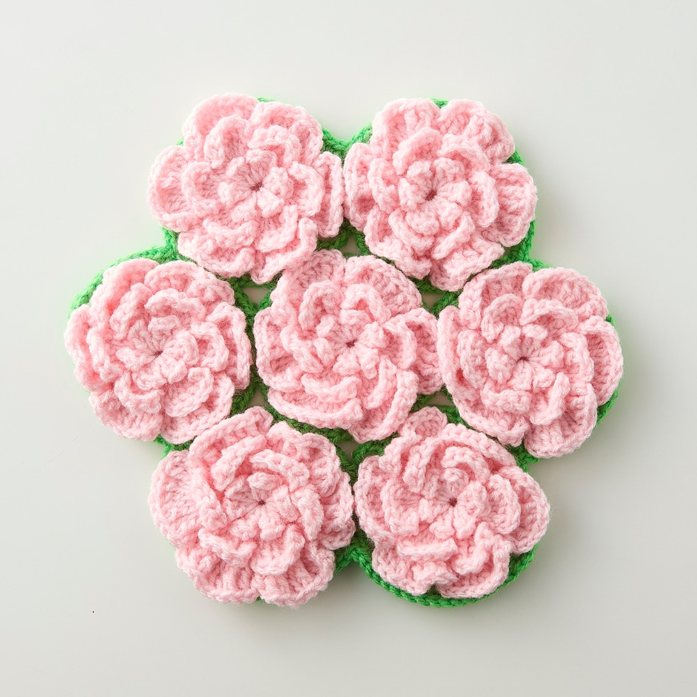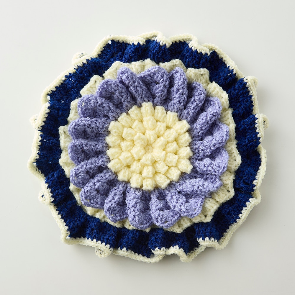ふっくらとしたお花のモチーフが暮らしに愛らしさを添えてくれる、かぎ針編みざぶとんの手作りキット。