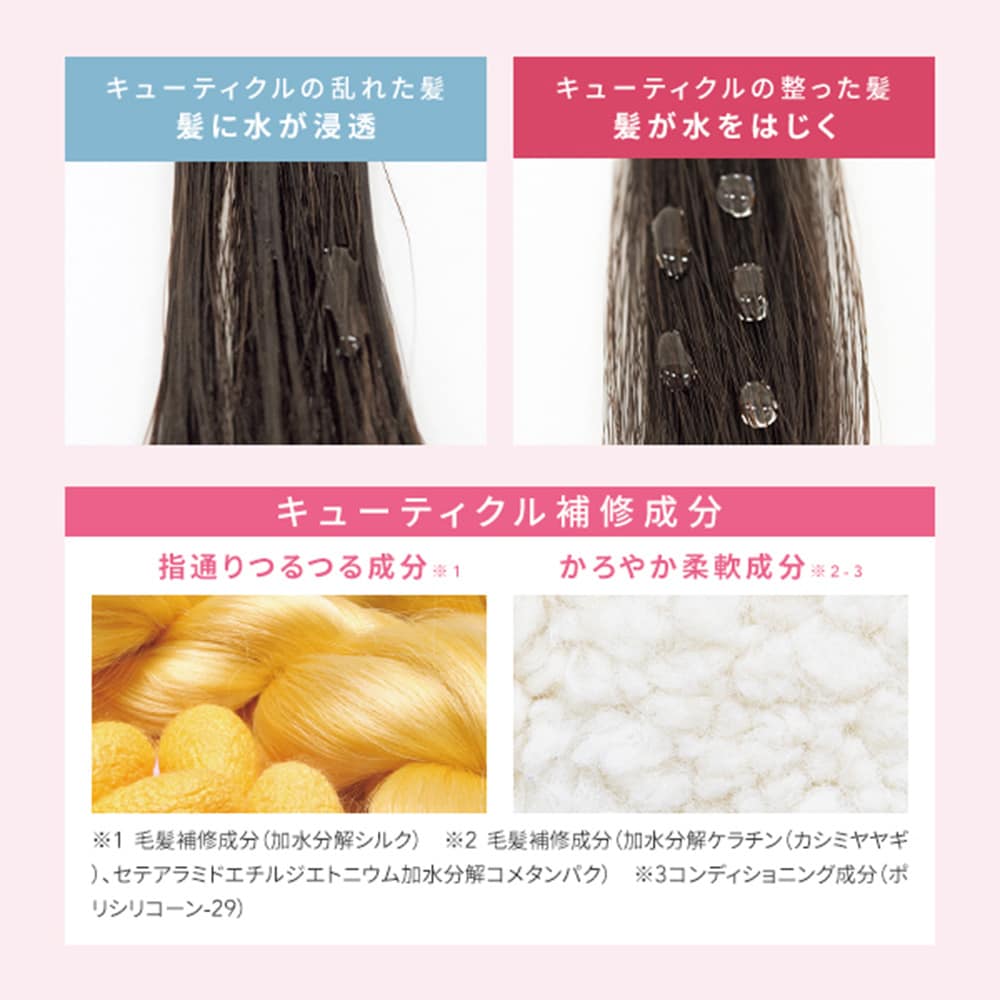 指通りつるつる成分(※1)とかろやか柔軟成分(※2)が傷んだキューティクルを整え、熱や湿気を防ぐプロテクト機能で朝のスタイルをキープします。