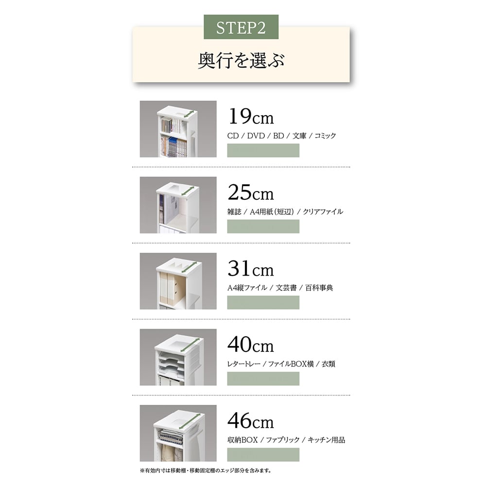 ●奥行は文庫本やコミックにちょうどよい19cmの薄型から市販の収納ボックスが入る46cmまで
