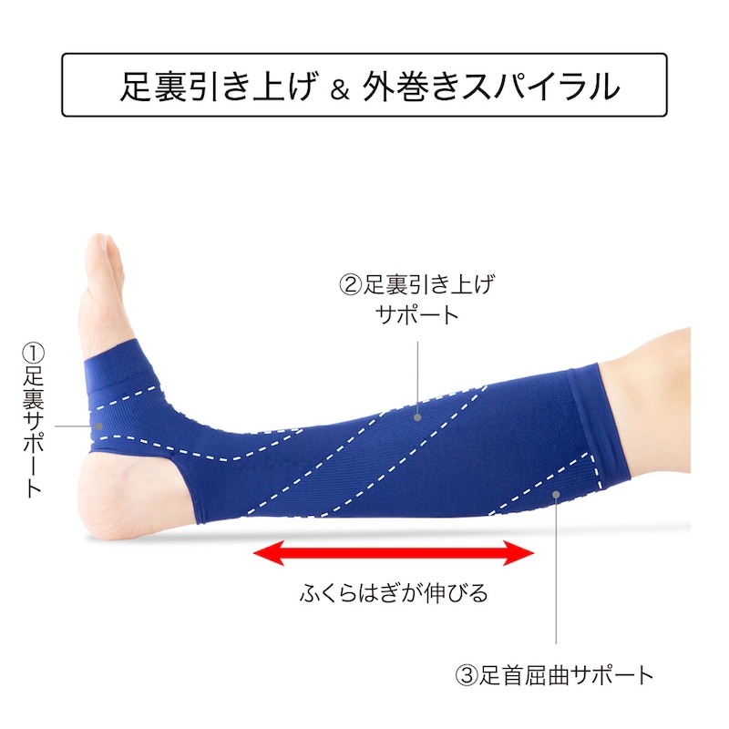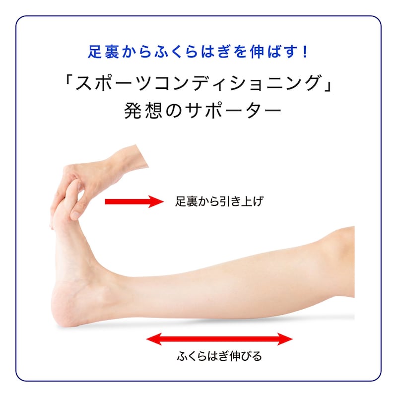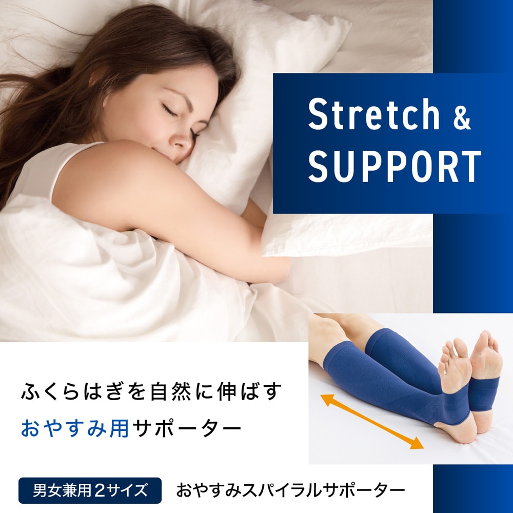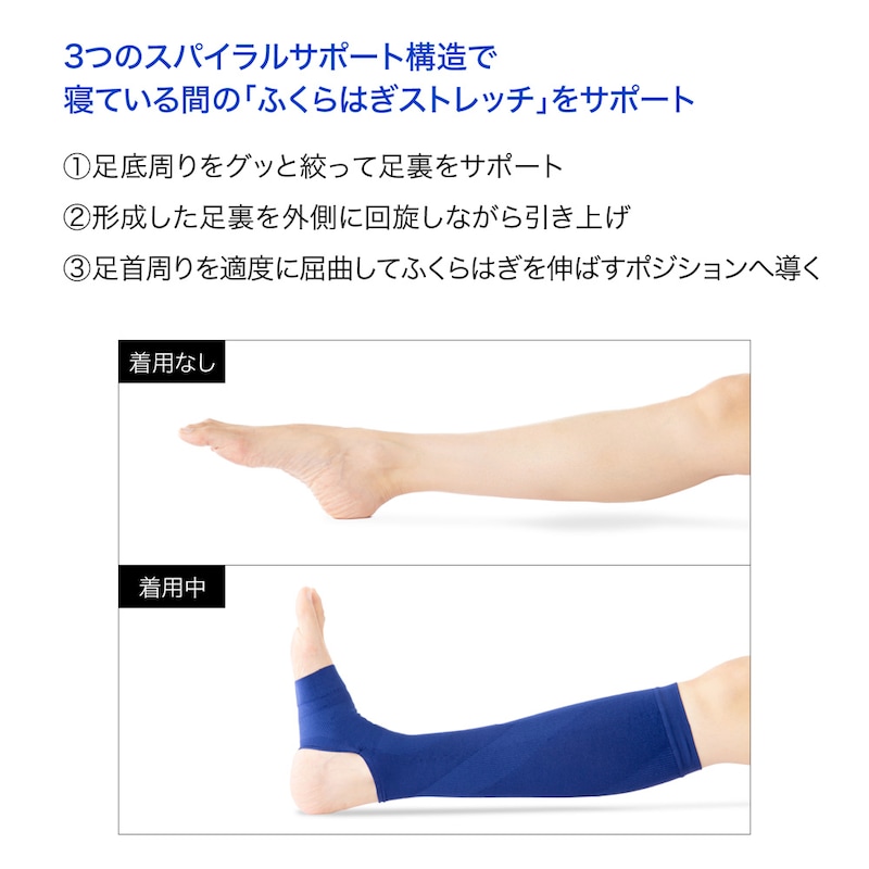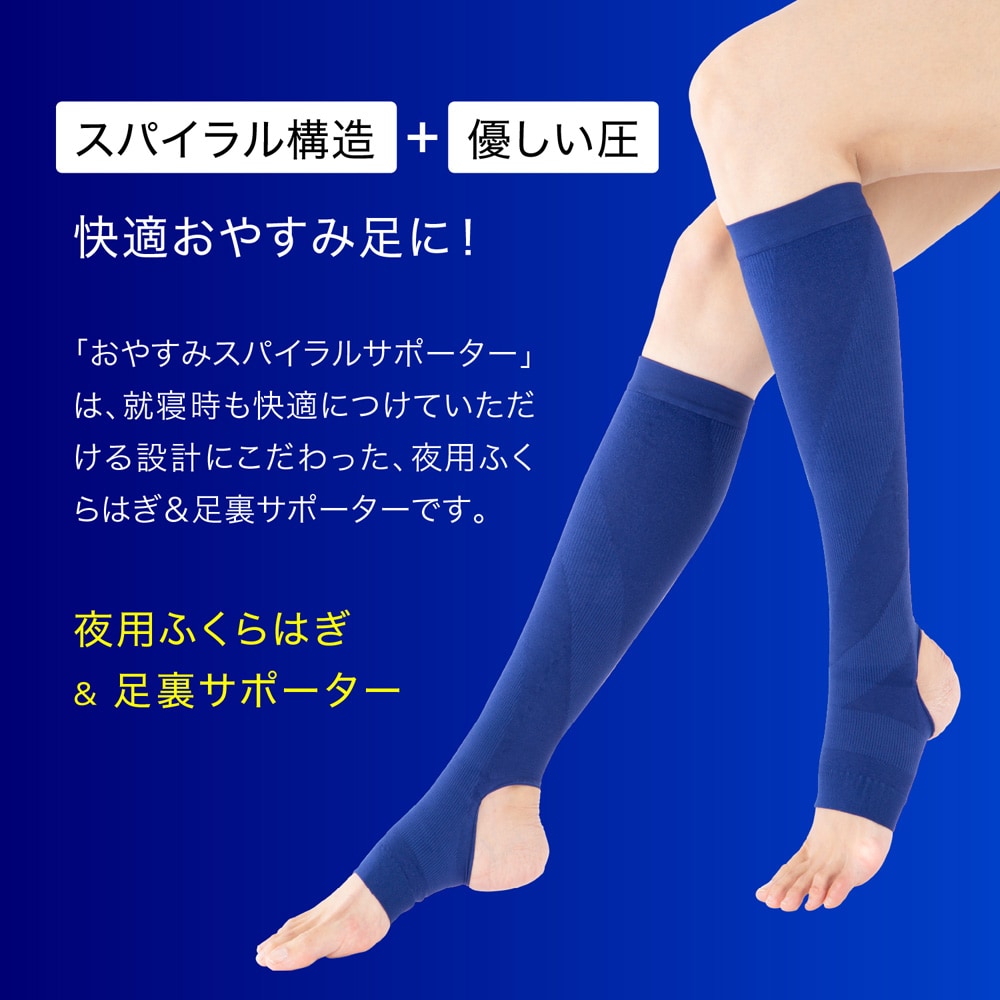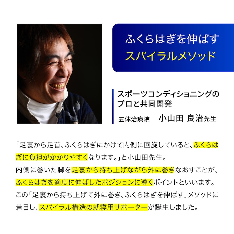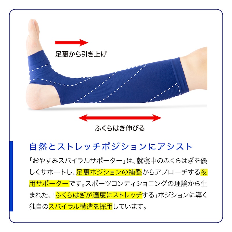 ●「おやすみスパイラルサポーター」は、スポーツコンディショニングの発想から生まれたふくらはぎをストレッチさせるサポーターです。