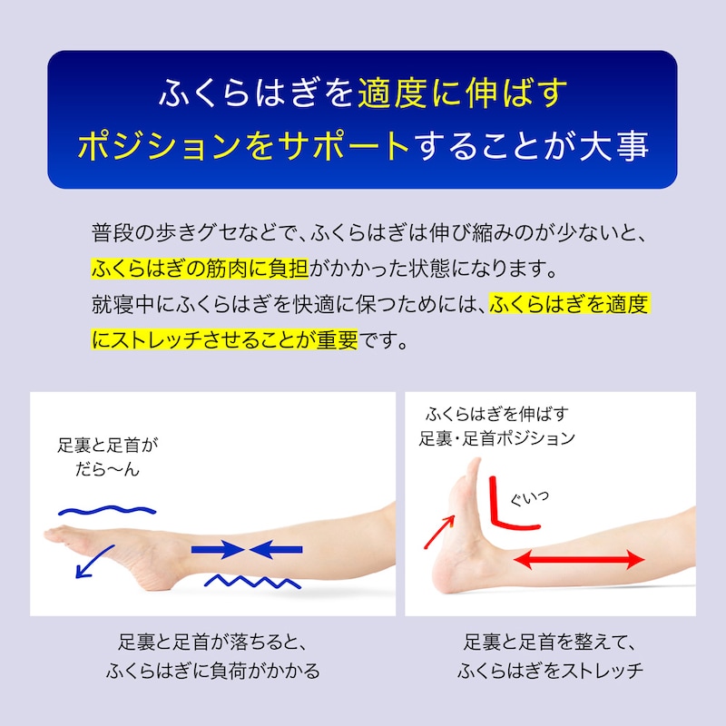 ●特殊なスパイラル構造が足裏から持ち上げて、ふくらはぎを気持ちよくストレッチさせ、就寝時の快適脚をサポートします。