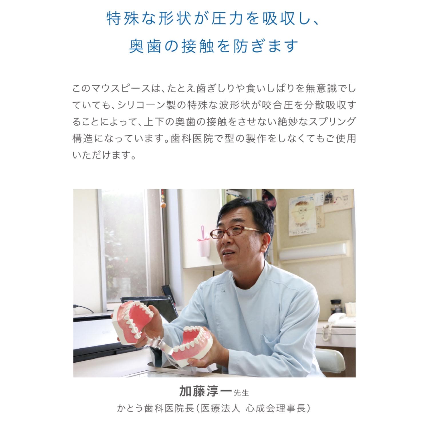 ●歯科医師・加藤淳一先生と共同開発した、睡眠時の歯圧を吸収するマウスピースです。●衛生的なシリコーンを使った特殊な形状が圧力を吸収し、歯やアゴへの負担を軽減。