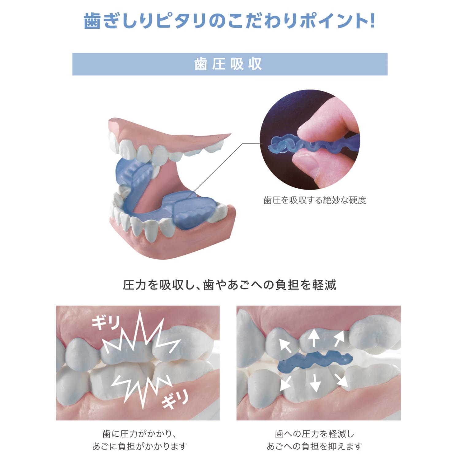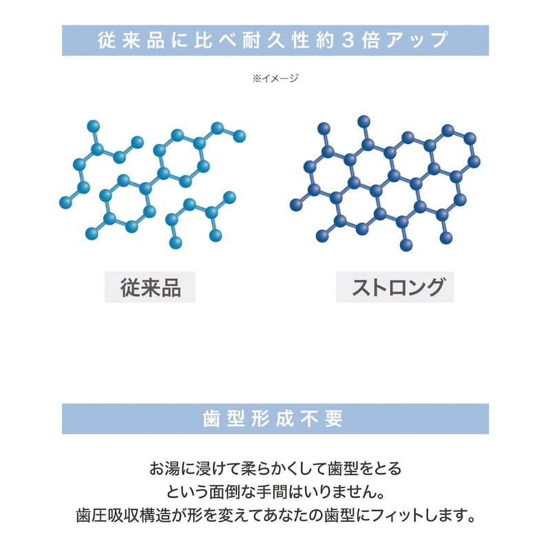 ●歯圧吸収構造が形を変えて使用者の歯形にフィットするから、面倒な歯型形成は不要。●男性でも女性でもお使いいただけます。