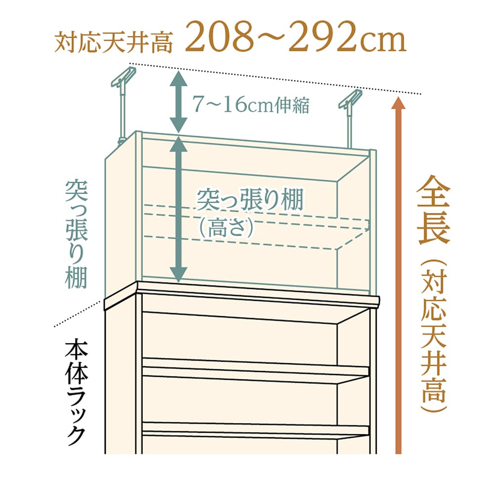 • 突っ張り金具の高さと取り付け時の寸法