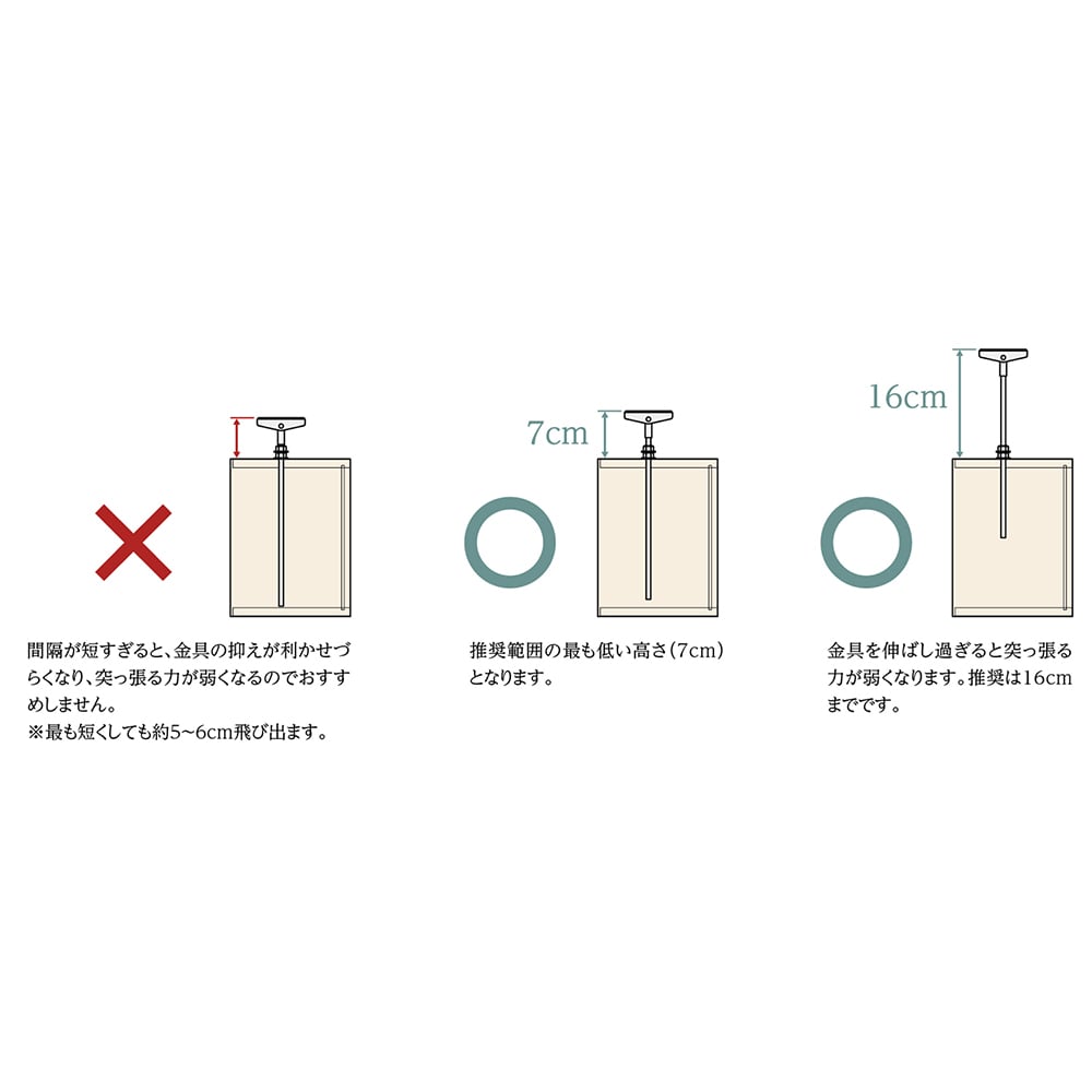 ※強度・安全性の面から突っ張り金具は高さ7~16cm内でご利用ください。