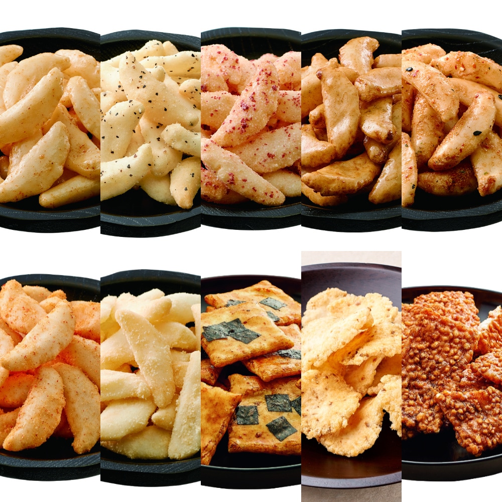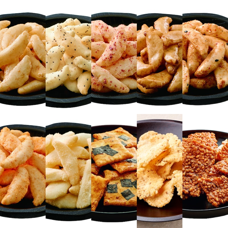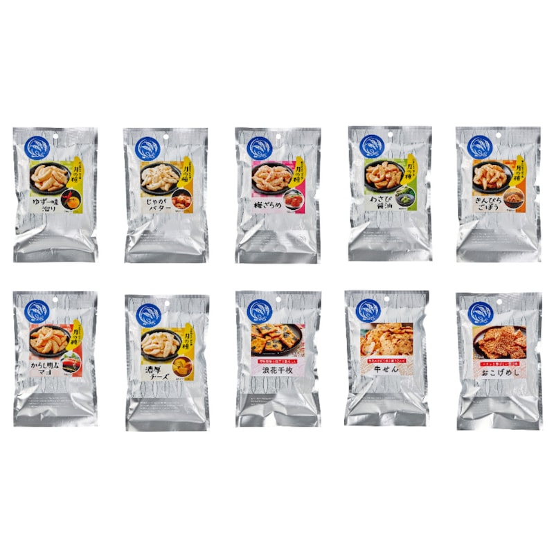 ●月の種ゆず一味溜り30g・月の種じゃがバター30g・月の種梅ざらめ30g・月の種わさび醤油30g・月の種きんぴらごぼう30g・月の種からし明太マヨ30g・月の種濃厚チーズ30g・浪花千枚30g・牛せん25g・おこげめし醤油30g:各1袋(計10袋)