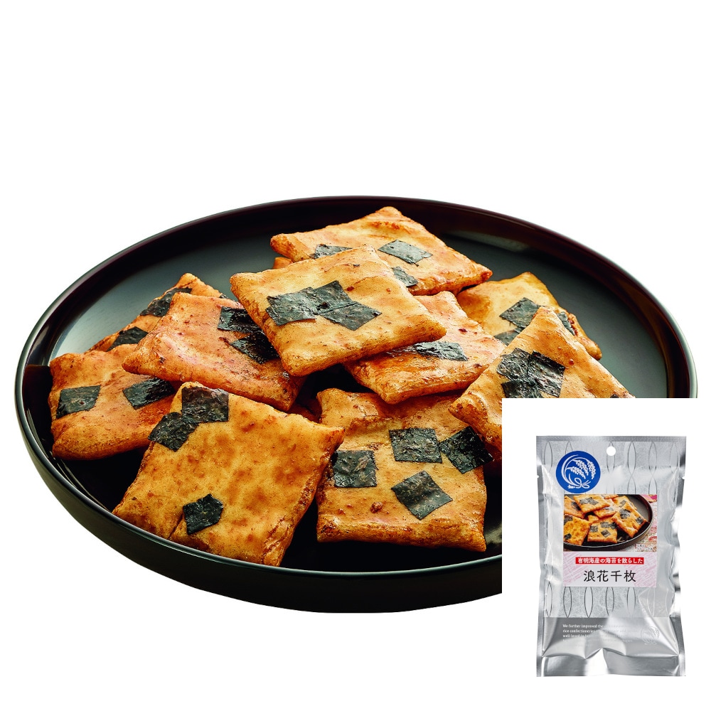 【浪花千枚】四角い薄型の甘口醤油あられに佐賀県有明海産の海苔を散らしています。