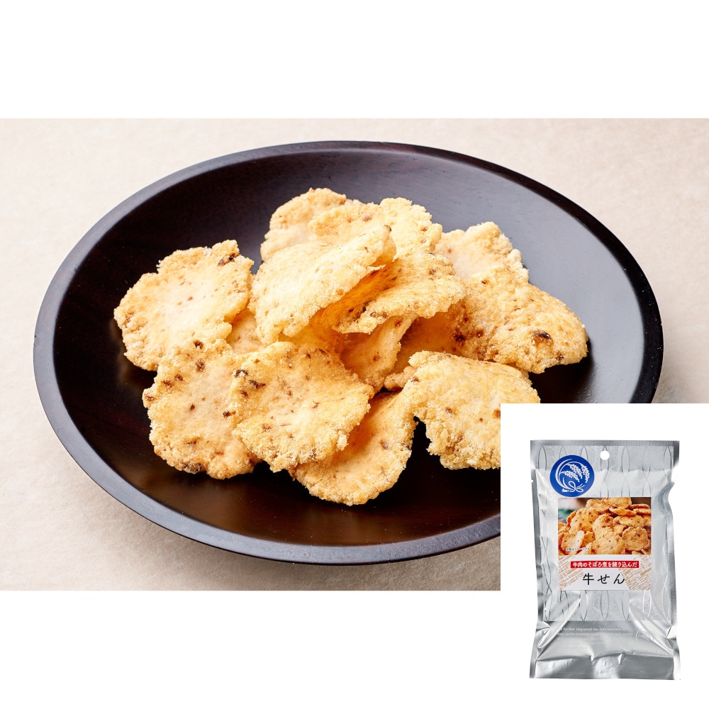【牛せん】牛肉のそぼろ煮を練り込み、サクサクとした食感で仕上げた揚げせんべいです