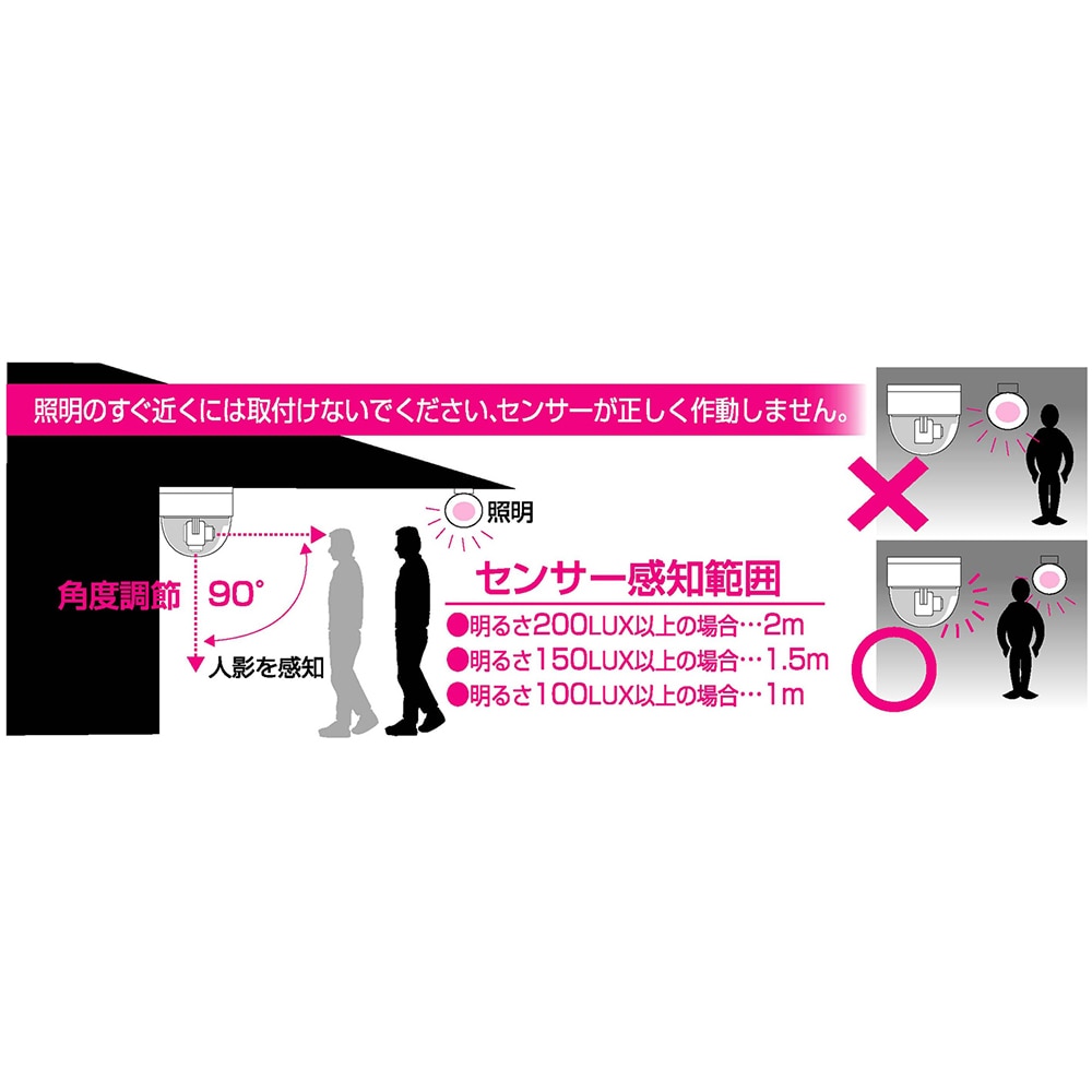 ●センサー感知範囲/200ルクス以上:約2m、150ルクス以上:約1.5m、100ルクス以上:約1m