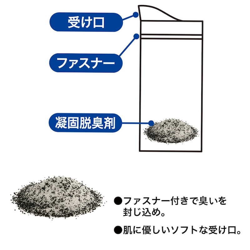 ●袋の中に高分子ポリマーとヤシ殻活性炭が入っているので、水分を固め、袋を閉めればしっかり脱臭します