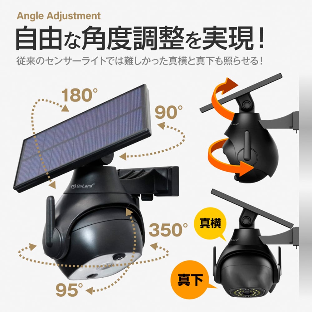 ●自由な角度調整を実現!従来のセンサーライトでは難しかった真横と真下も照らせる!