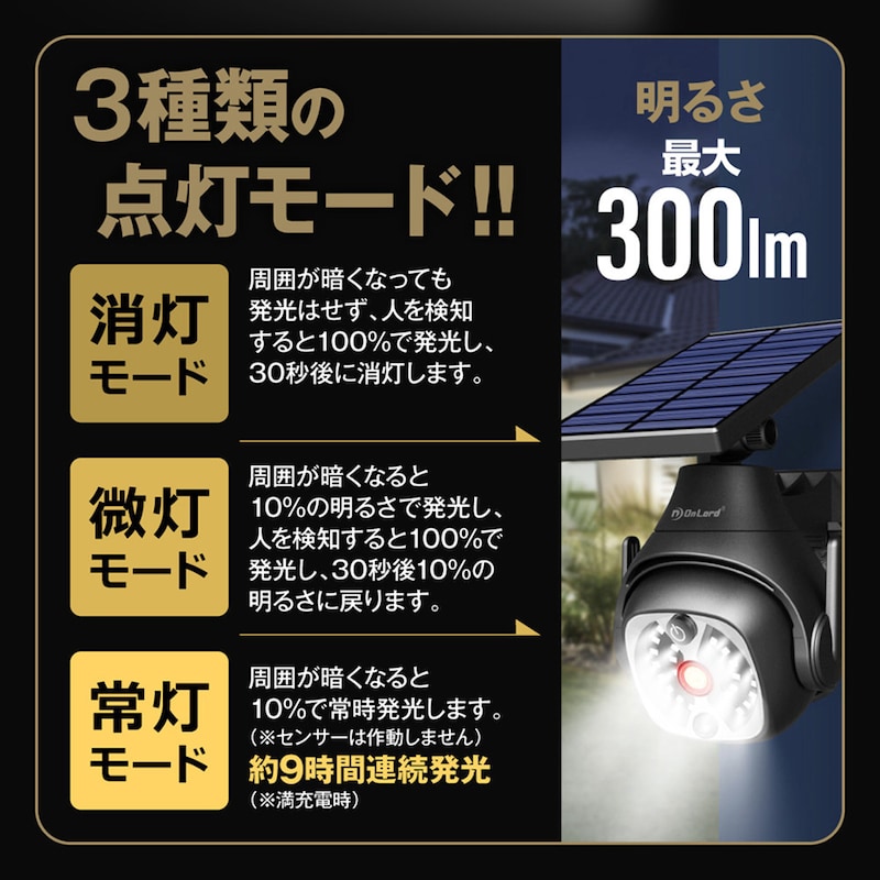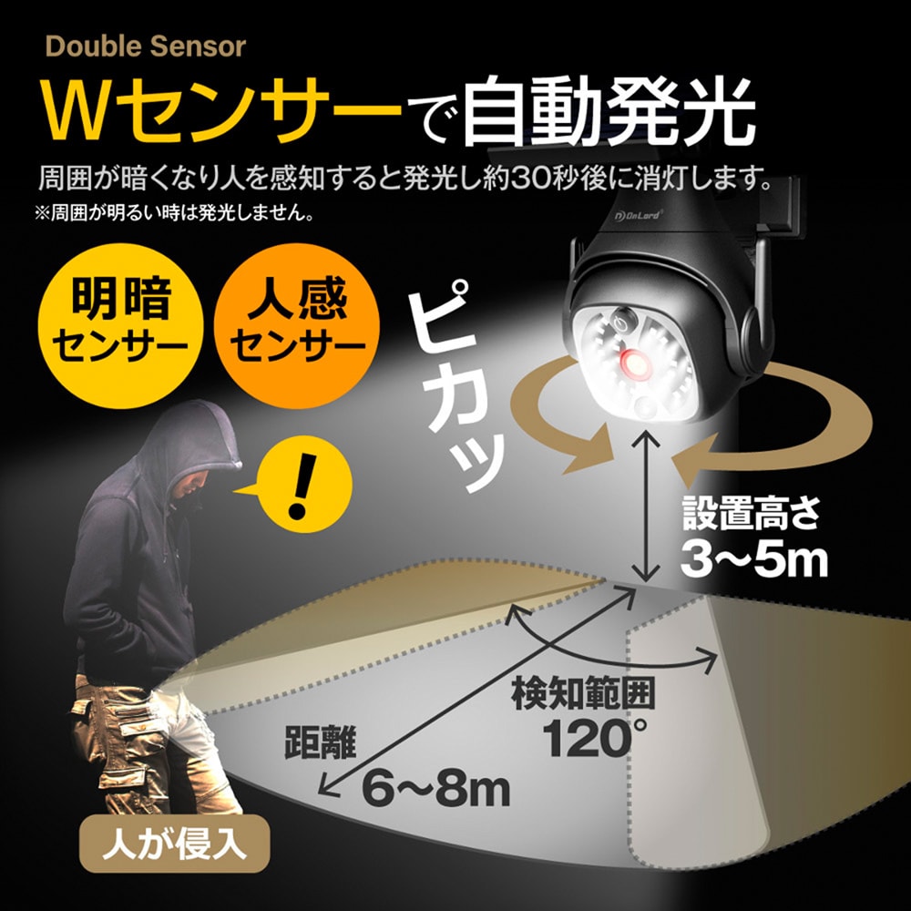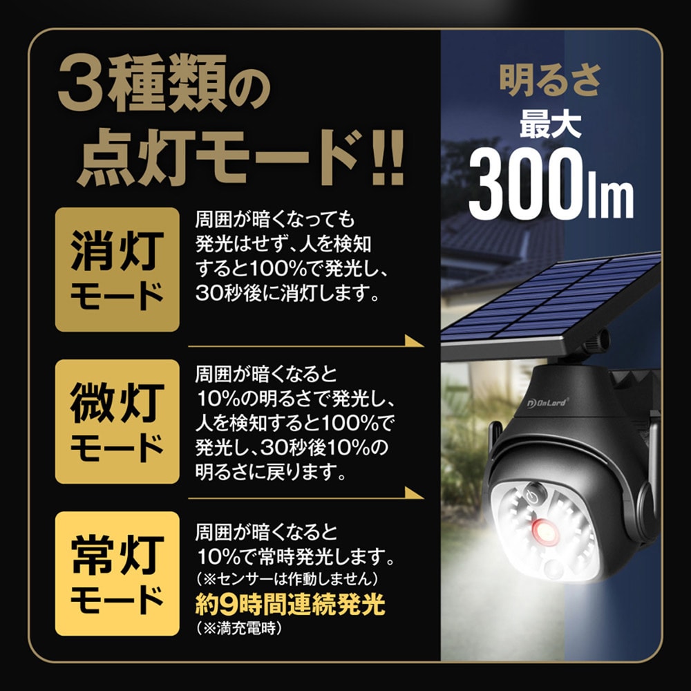 ●昼間はソーラーパネルで太陽光を効率的に充電!夜間は人感センサーで自動発光!