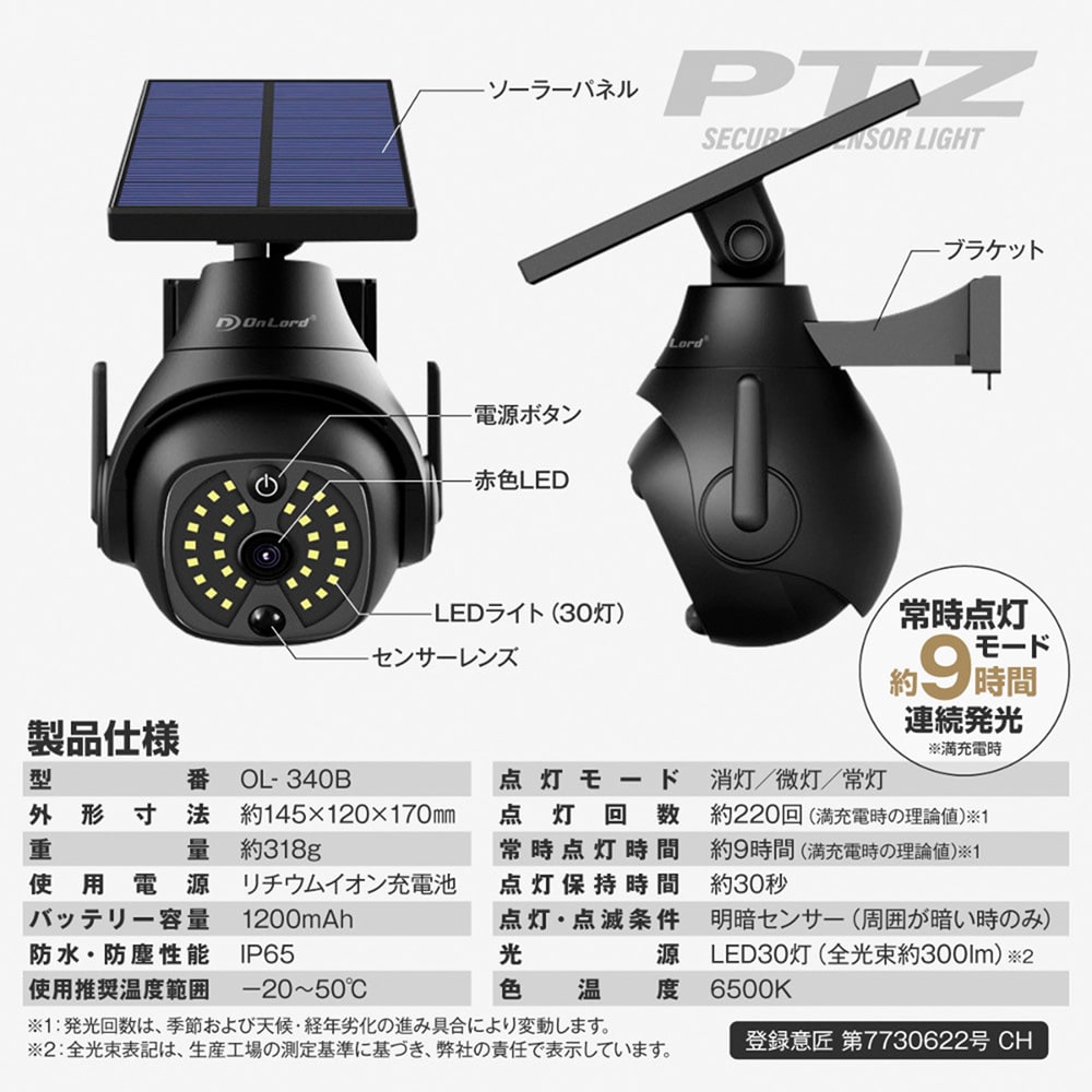 ●PTZ型防犯カメラの形をした圧倒的な存在感のセンサーライトで不審者の侵入を抑止!