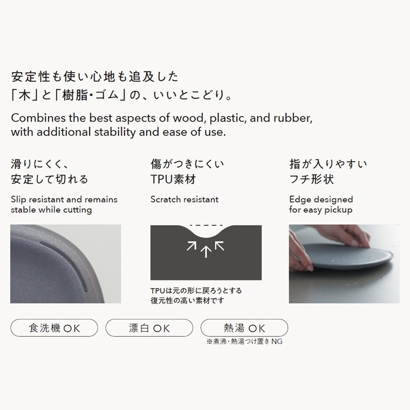 「木」と「樹脂・ゴム」の、いいとこどり。安定性も使い心地も追求したまな板 【食洗機対応】