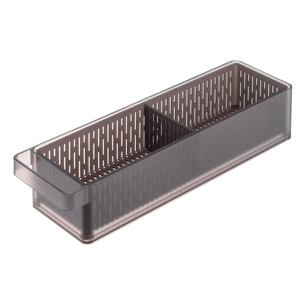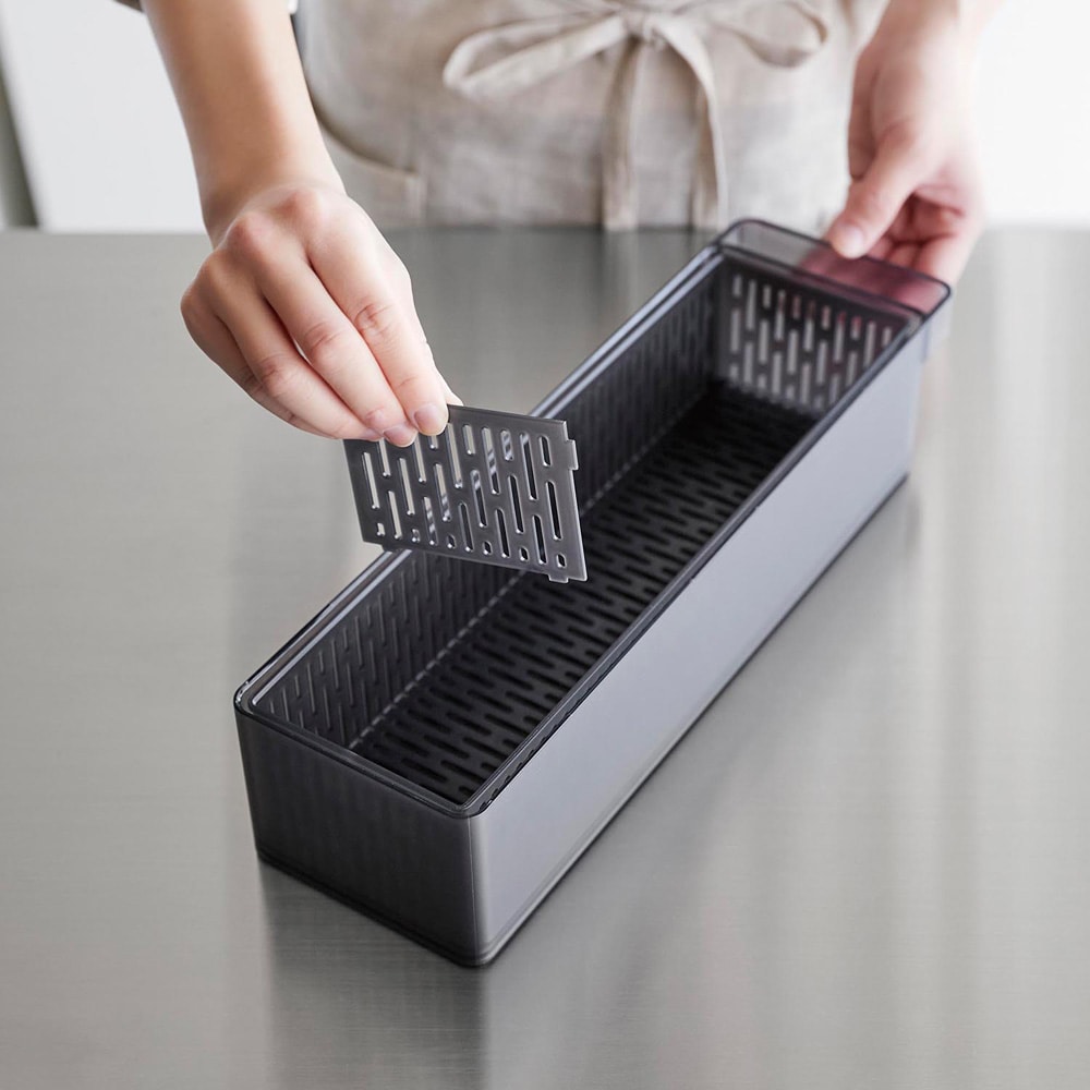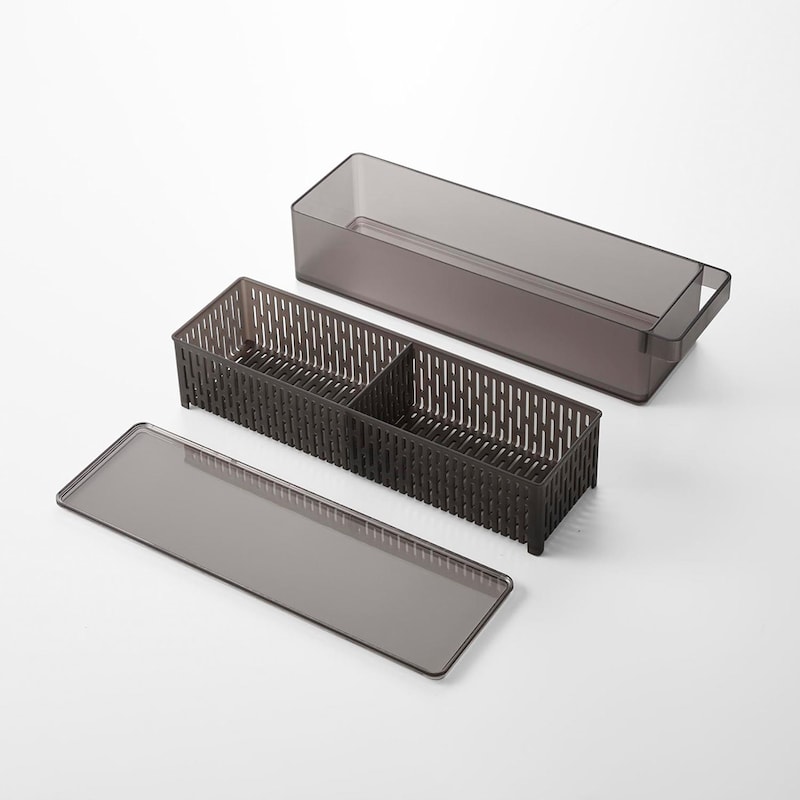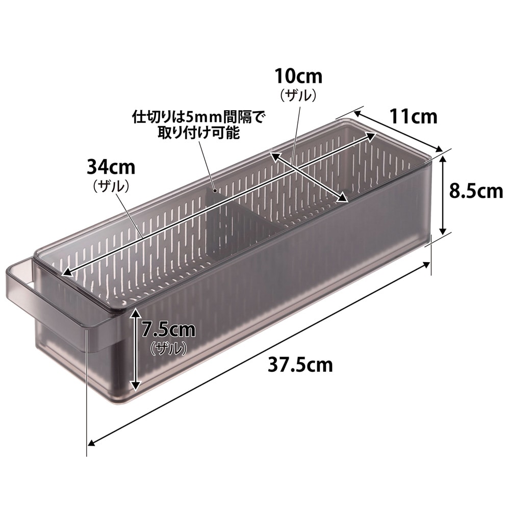 ●内寸サイズ/容器:開口部幅約34.5、奥行約10.5、高さ約7.5cm、ザル:開口部幅約33.2、奥行約9.5、高さ約6.7cm(仕切りは5mm間隔で取り付け可能)