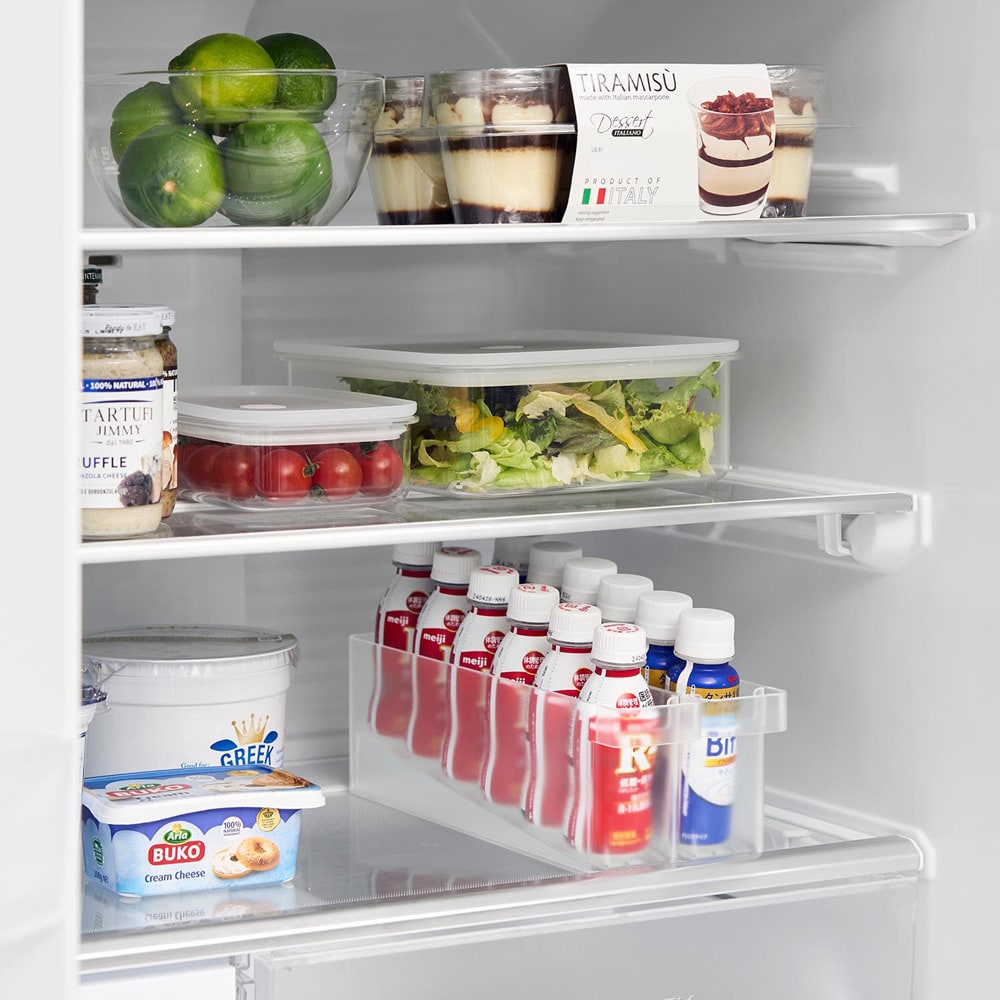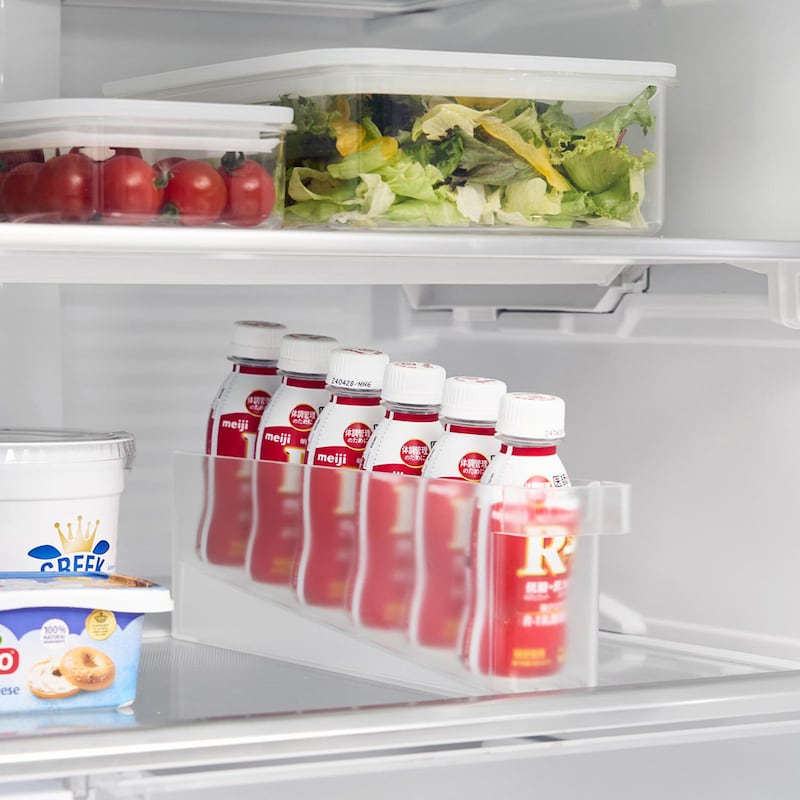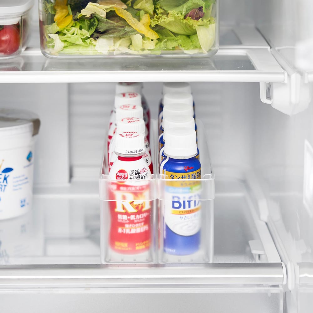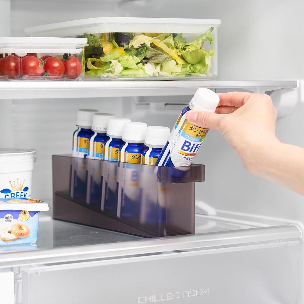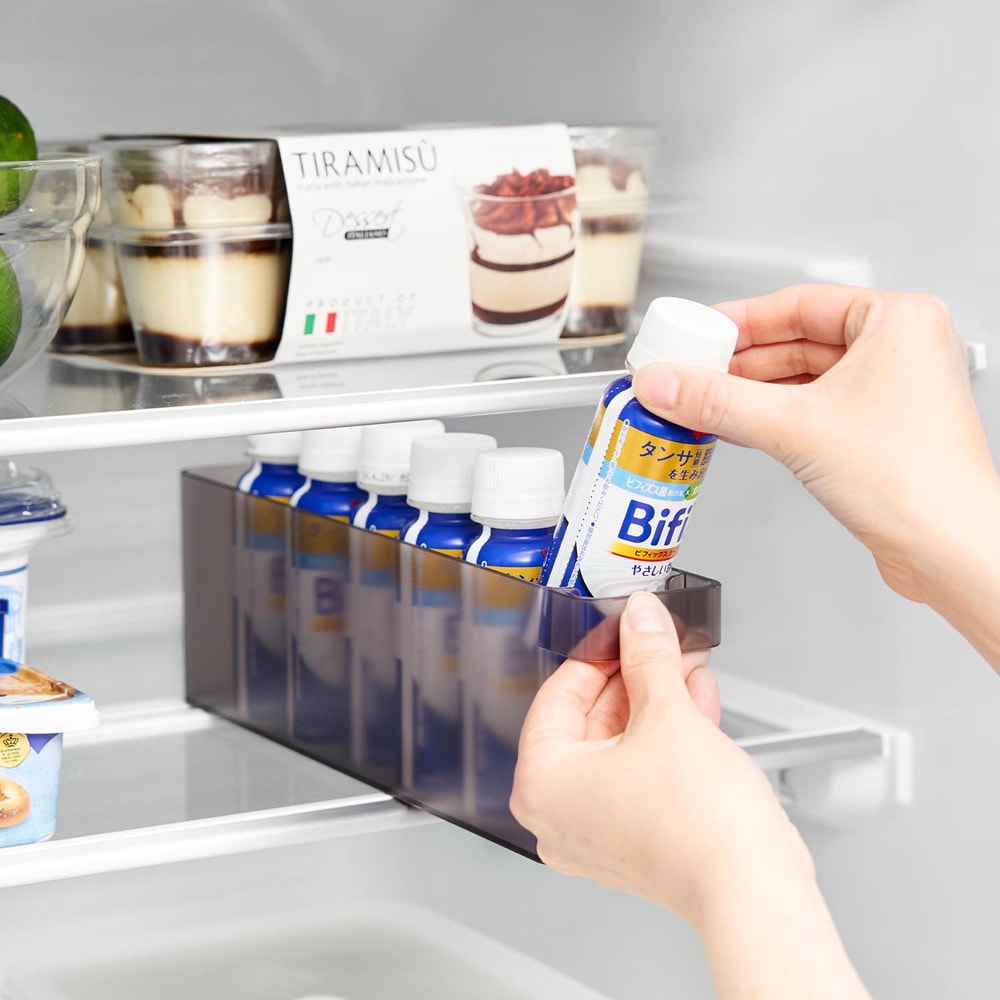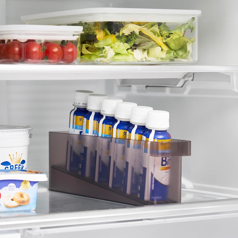 いつもミニドリンクを家族分箱買いしているので整理をするのに100均のケースを使っていましたが、手前から取るのでだんだん奥にある分が取り出しにくくなっていました。でもこれは台座を置くと傾斜ができて1本取れば奥から自動で前にずれてきてくれるのですごく便利。毎日の事なので、この小さな手間を減らしてくれる機能は予想以上に便利でした!