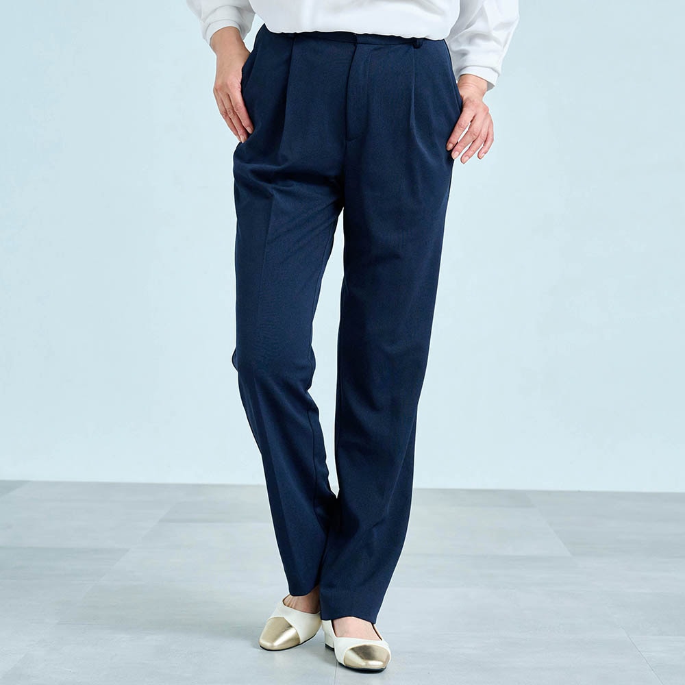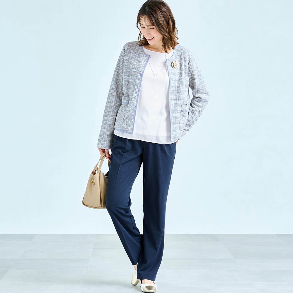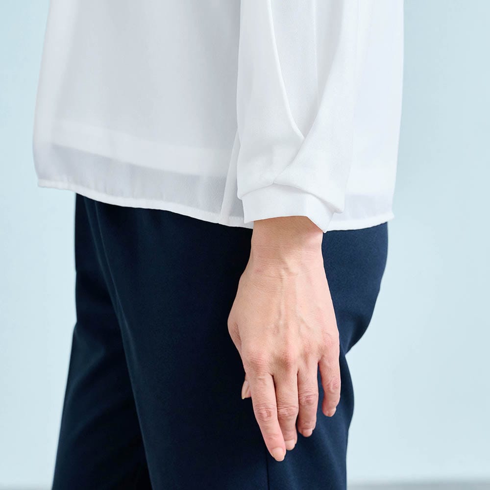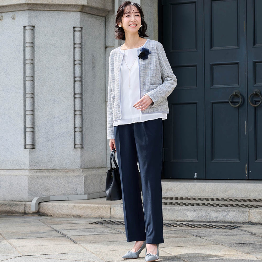 156センチがっちり体型なので、いつも肩や二の腕がキツめになるのですが、このパンツスーツはストレッチ性があり、とても着やすく動きやすかったです。
