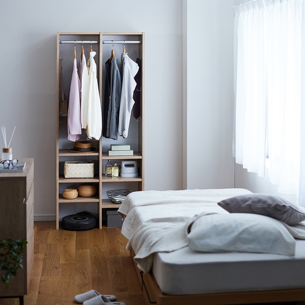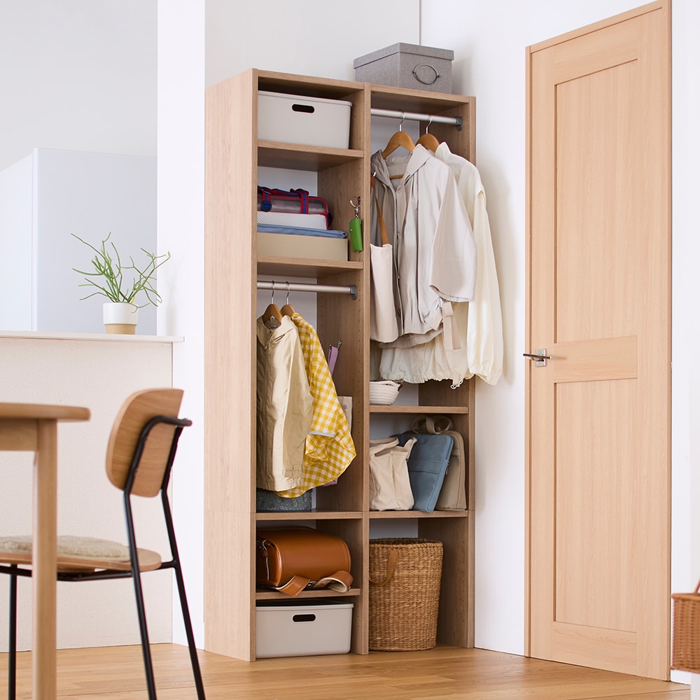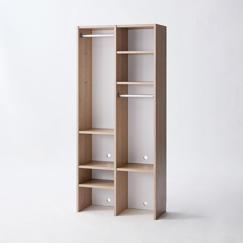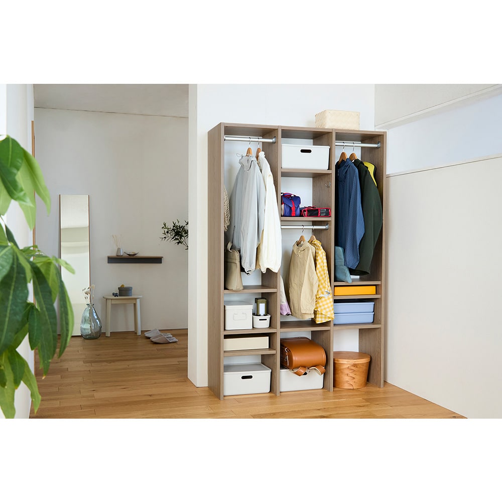 ●各列に可動棚2枚とハンガーバー付きで、身長や収納物に合わせて自由にカスタマイズ可能です。