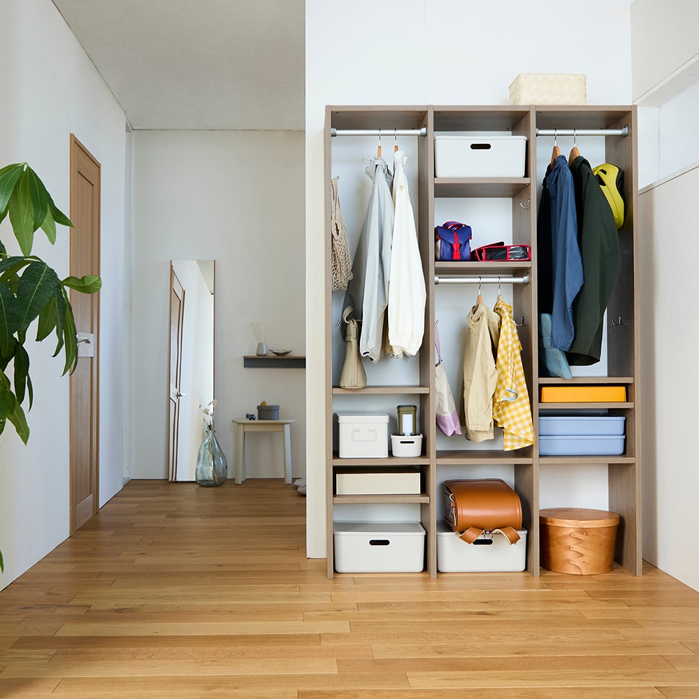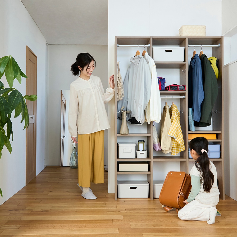 一人ひとりの専用収納スペースを作ることで、子どもやご主人の自発的な片付けを促し、朝の身支度をスムーズにしたい方におすすめです。