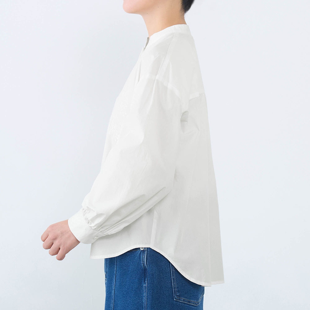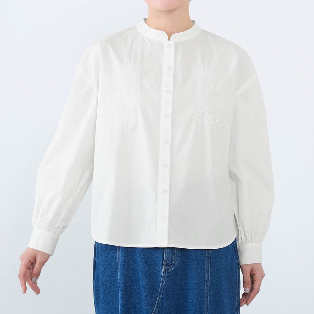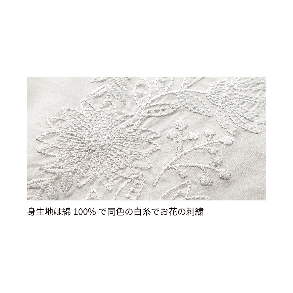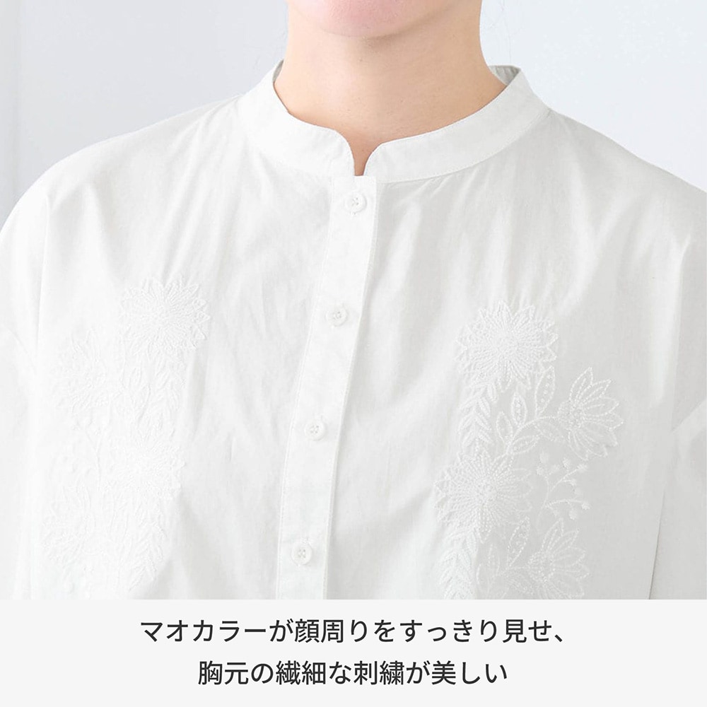 白に刺繍。素敵なデザインです。首周りも開き過ぎず、とても着やすいです。着回しも悩まず、何にでも合う、自然、清潔なイメージで使いやすいです。生地も厚過ぎず、薄過ぎず。白なので下に着たものは透けますが、想定内でした。これからの季節大活躍しそう。