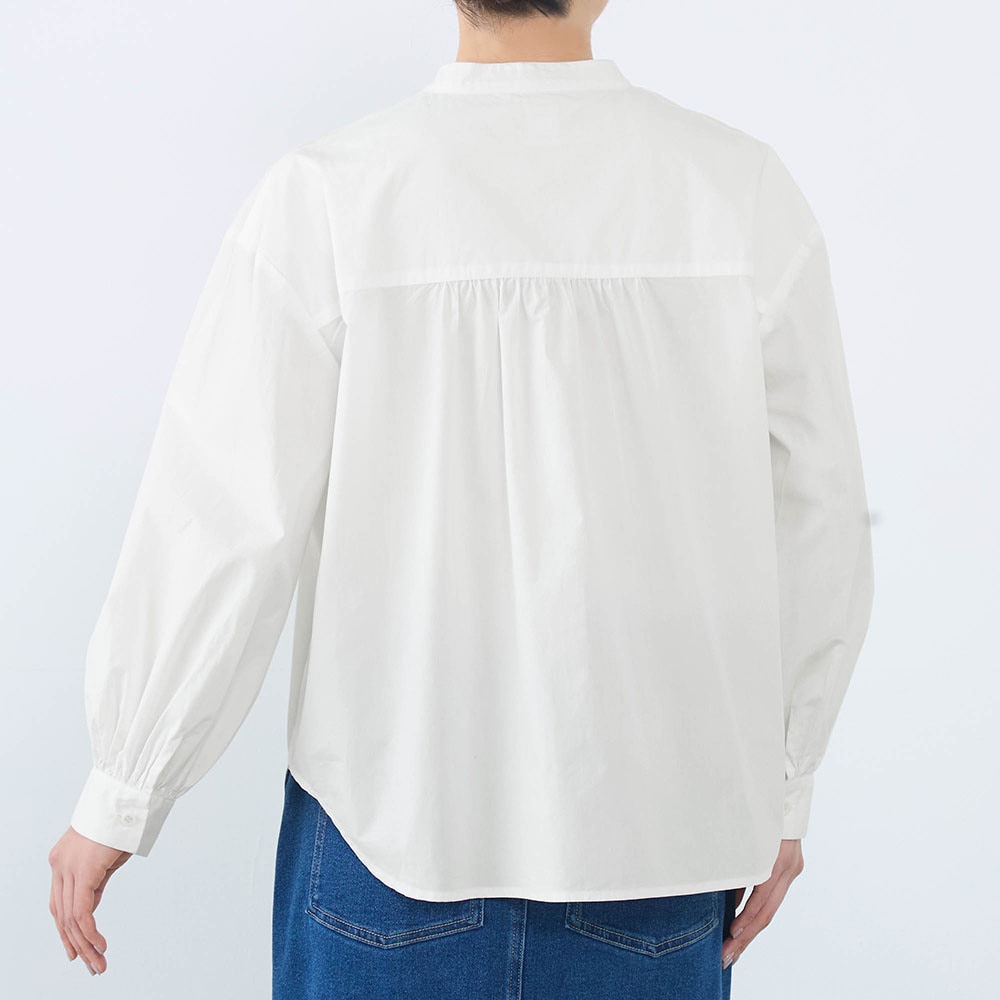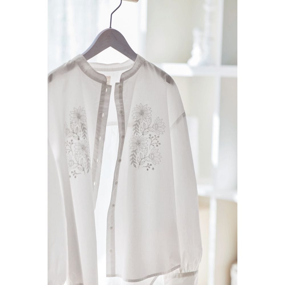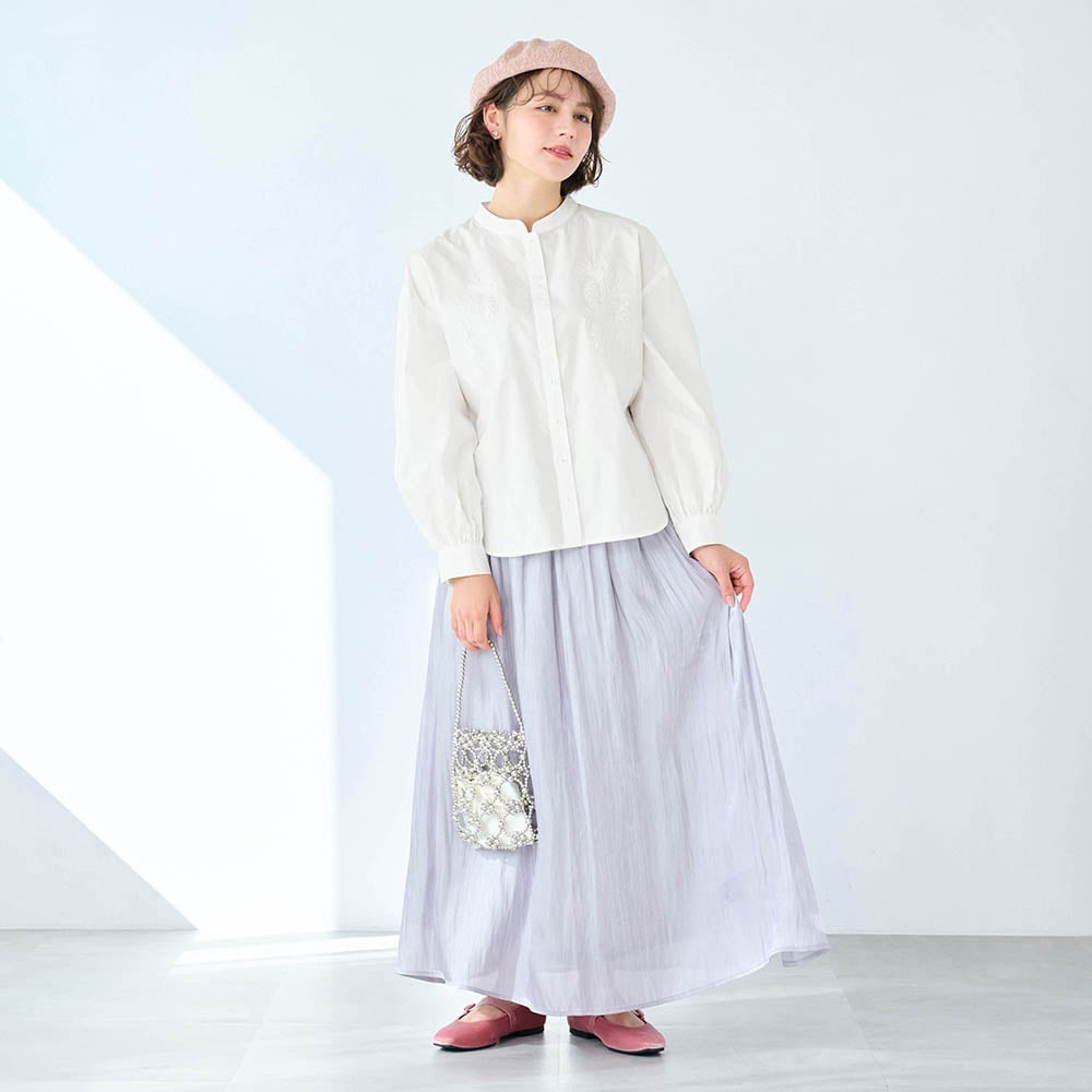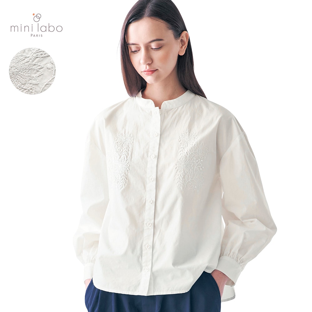 白に刺繍。素敵なデザインです。首周りも開き過ぎず、とても着やすいです。着回しも悩まず、何にでも合う、自然、清潔なイメージで使いやすいです。生地も厚過ぎず、薄過ぎず。白なので下に着たものは透けますが、想定内でした。これからの季節大活躍しそう。