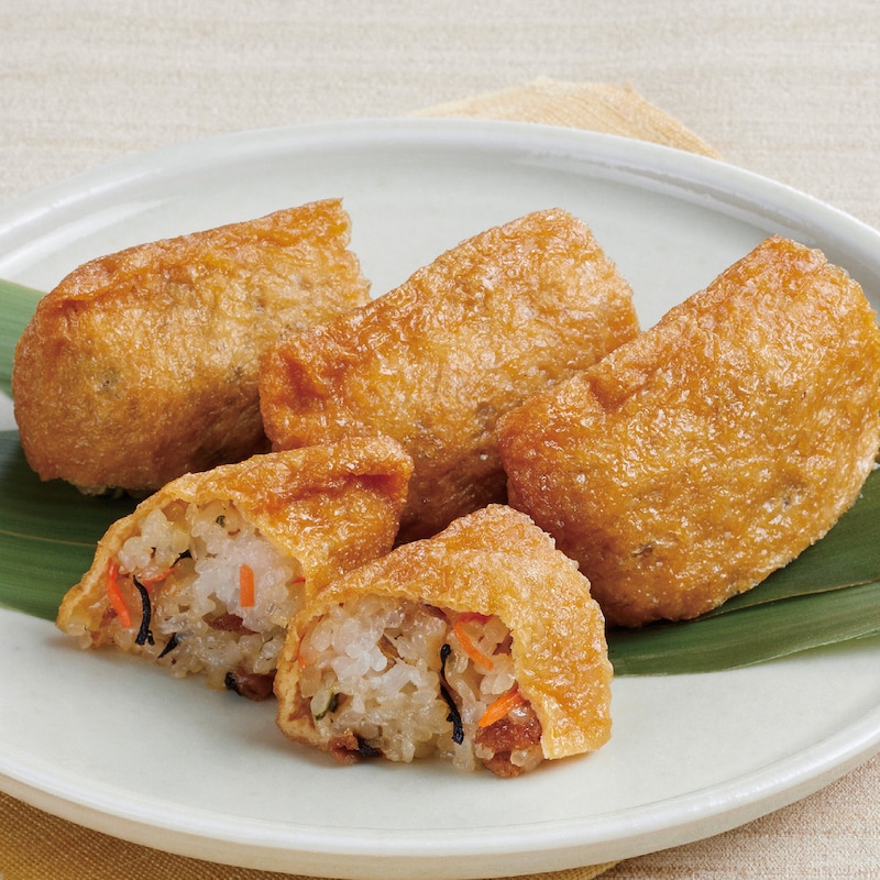新潟県産もち米に七目の国産食材を混ぜ込んだ、具沢山な手作りいなり。朝から常温解凍すればお昼には食べ頃に。