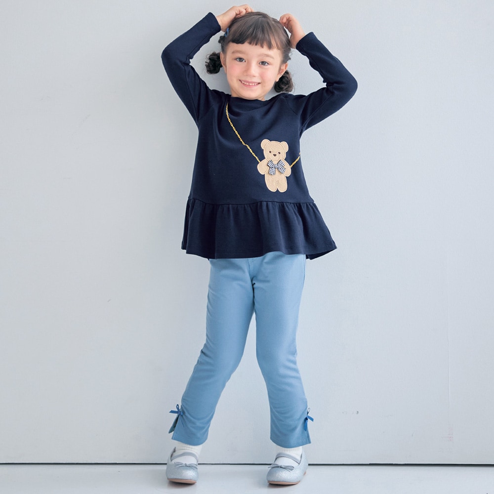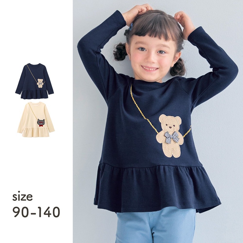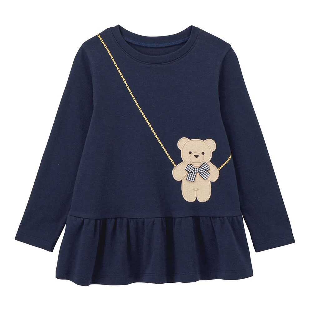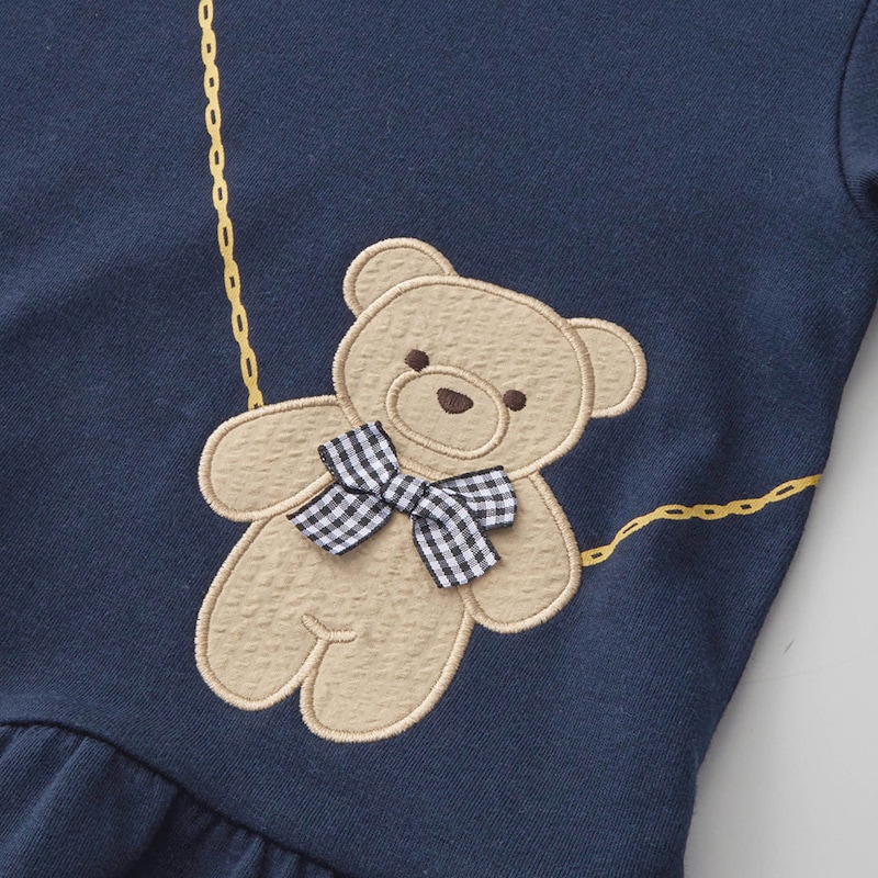 ネイビーとゴールドチェーン風のプリントで、普段着の着やすさや可愛さと、上品さが兼ねられてとても気に入りました!身長125ですが、すぐ暑くなるので来シーズンも着られるよう&乾燥機を使用するので140を購入し、袖を1回折で着ています。