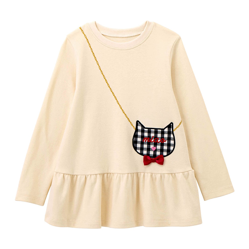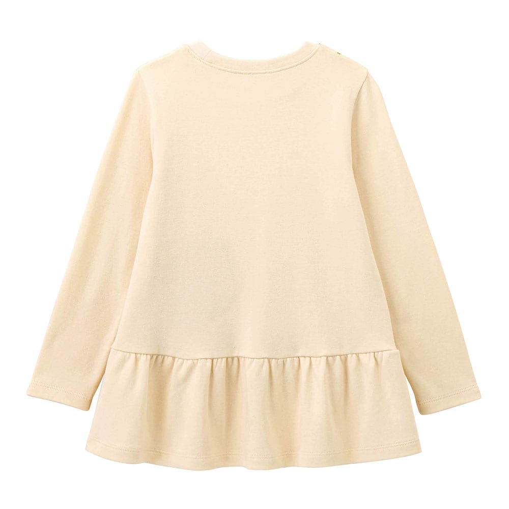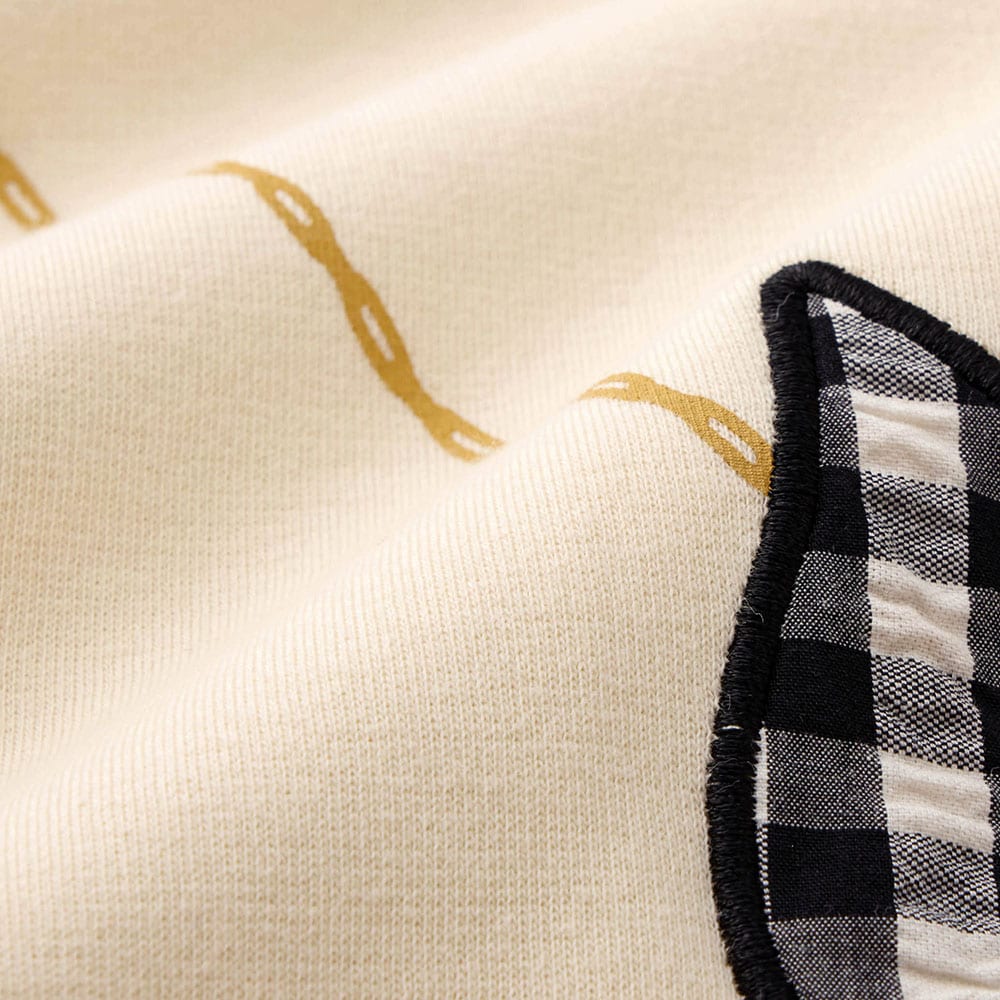 ネイビーとゴールドチェーン風のプリントで、普段着の着やすさや可愛さと、上品さが兼ねられてとても気に入りました!身長125ですが、すぐ暑くなるので来シーズンも着られるよう&乾燥機を使用するので140を購入し、袖を1回折で着ています。