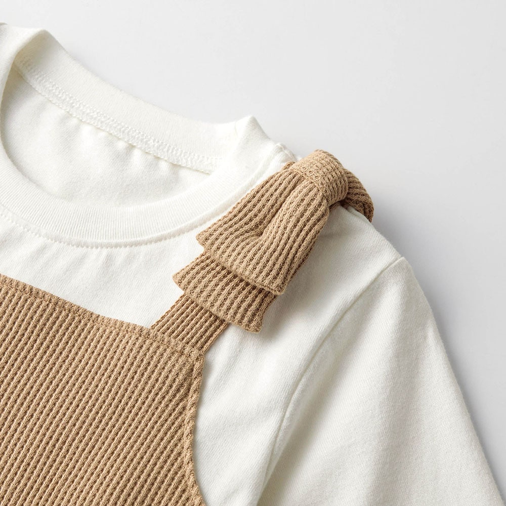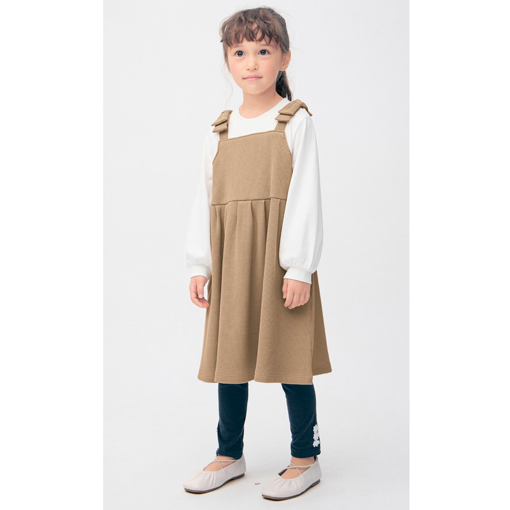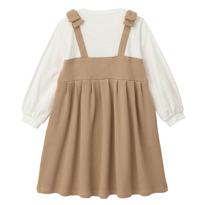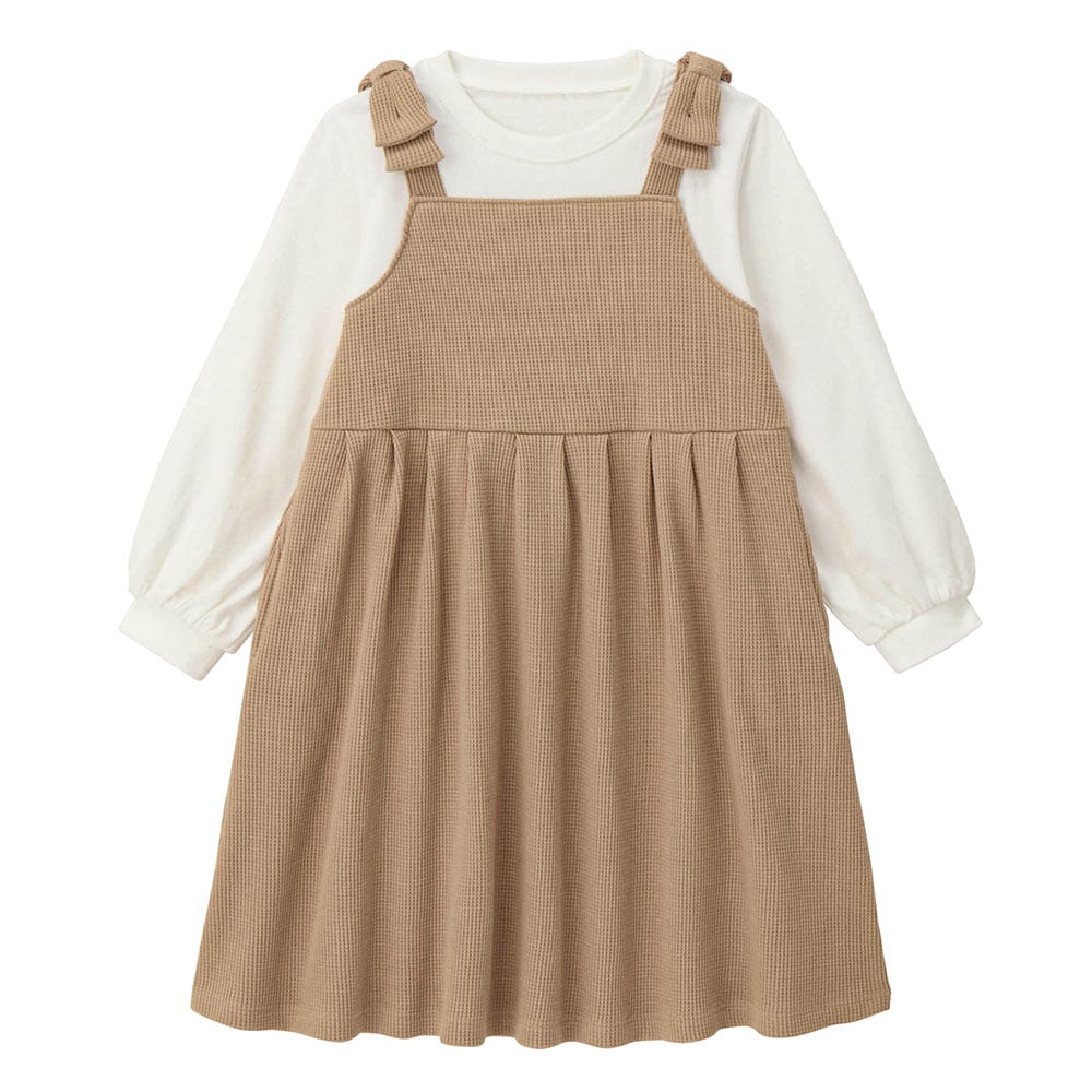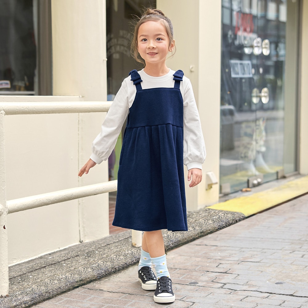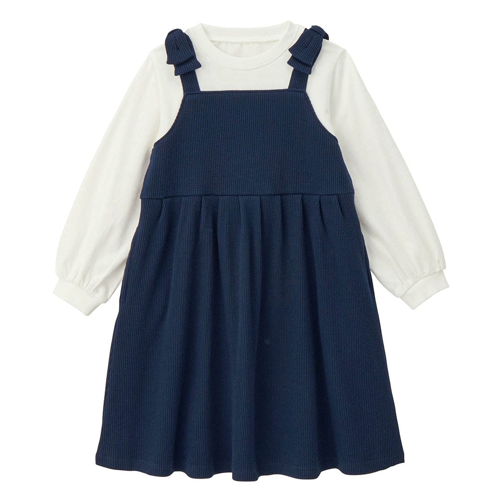 肩リボンワッフルジャンスカドッキングワンピース 【子供服 長袖】