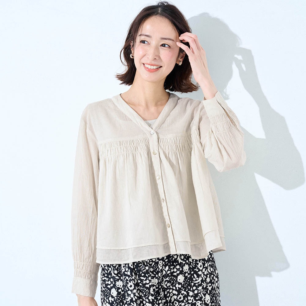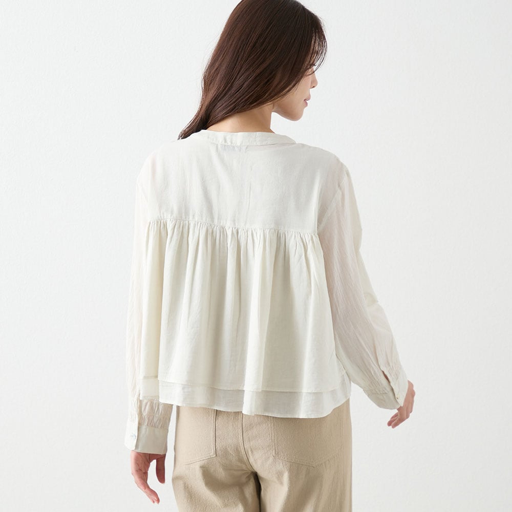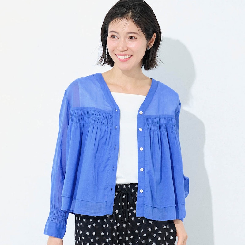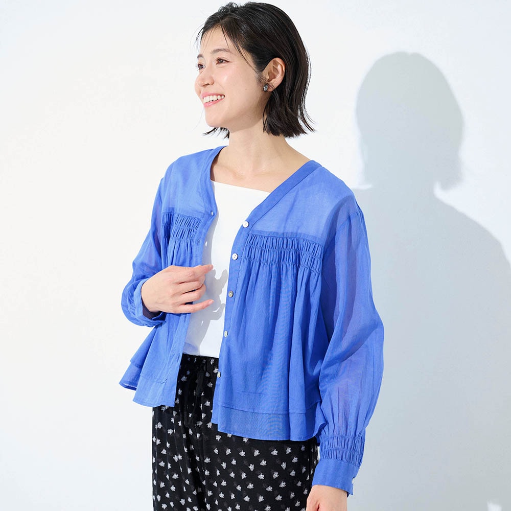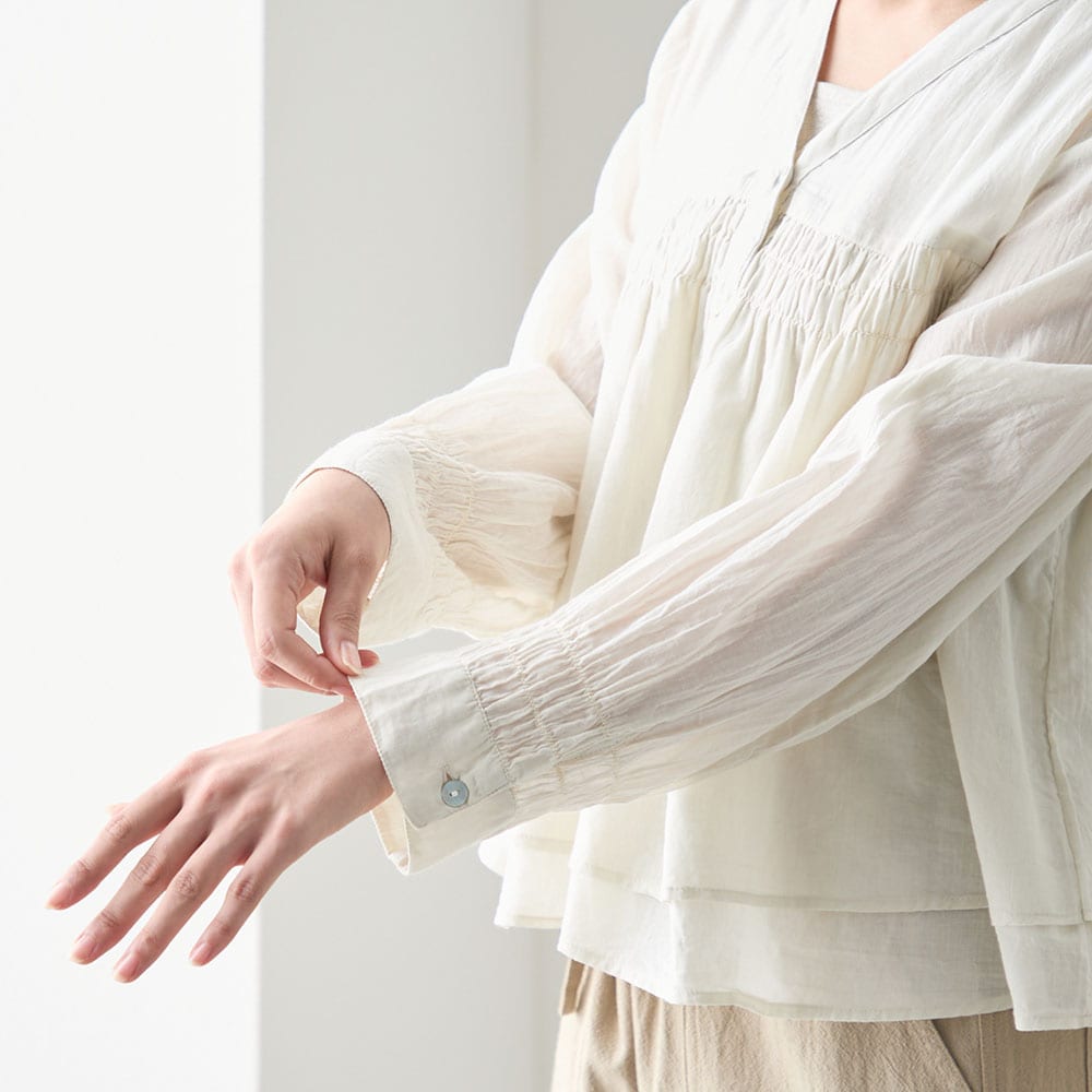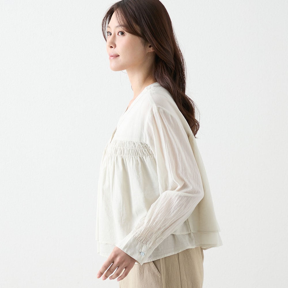 夏に着る薄手の長袖が欲しくて探していました。シャーリングから下は少し広がっていて短めの丈が気に入りました。ただかなり薄手なので中にしっかり着ないと透けてしまいます。洗濯をしたらどうなるか少し心配です。