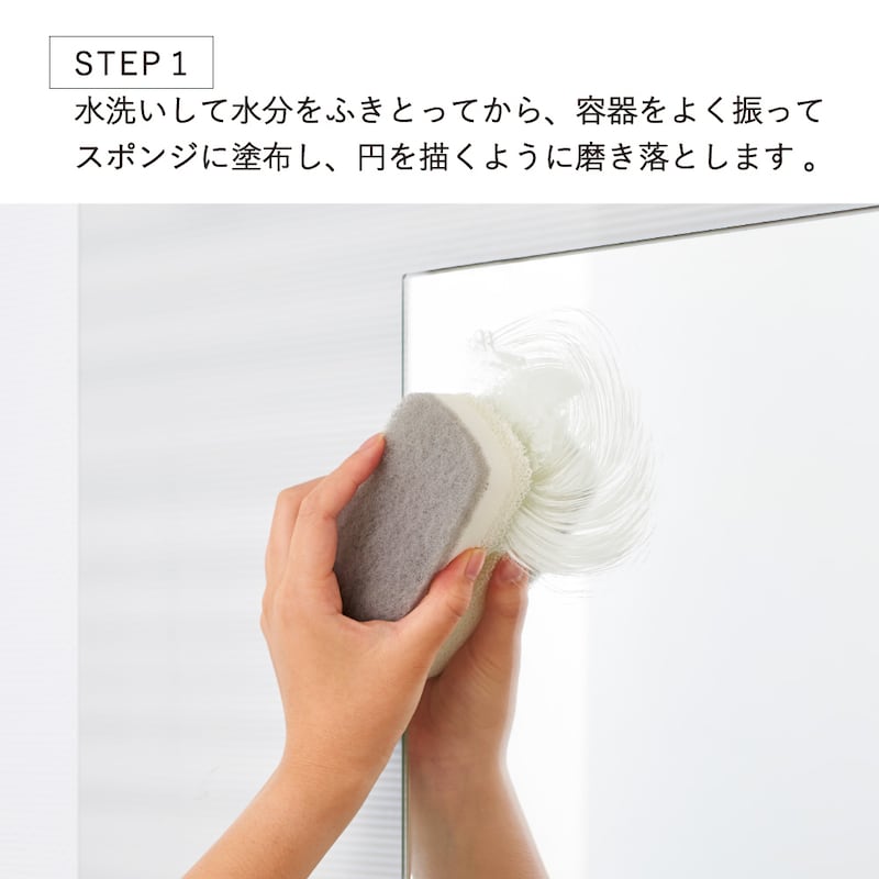軽く水分を拭き取り、容器をよく振ってからスポンジに適量塗布し、円を描くように磨き落とします。