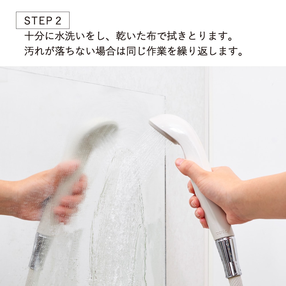 STEP2:その後十分に水洗いをし、乾いた布で拭きとります。汚れが落ちない場合は同じ作業を繰り返します。
