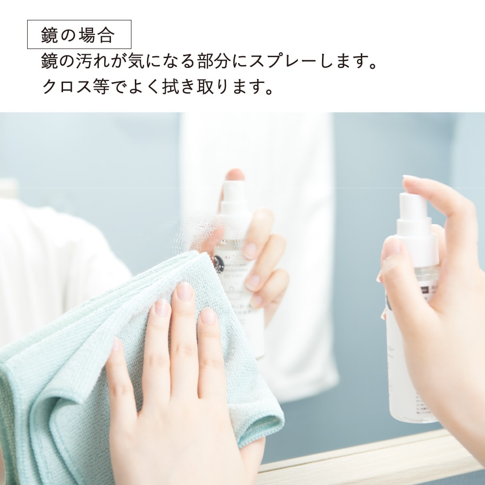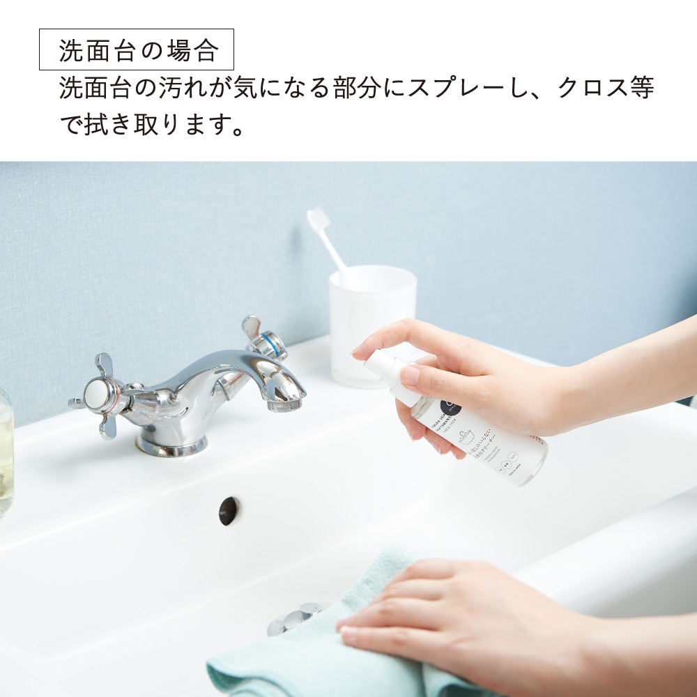 水を使わずにクロス等で拭き上げるだけ。洗面台周りや鏡にも使える