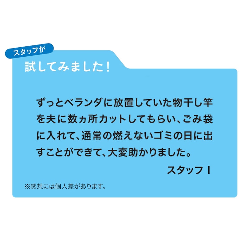 かさばる段ボールから硬い鉄パイプまで、これ1本でいろんな粗大ゴミが解体でき、通常の燃えないゴミの日に出せて大助かり。