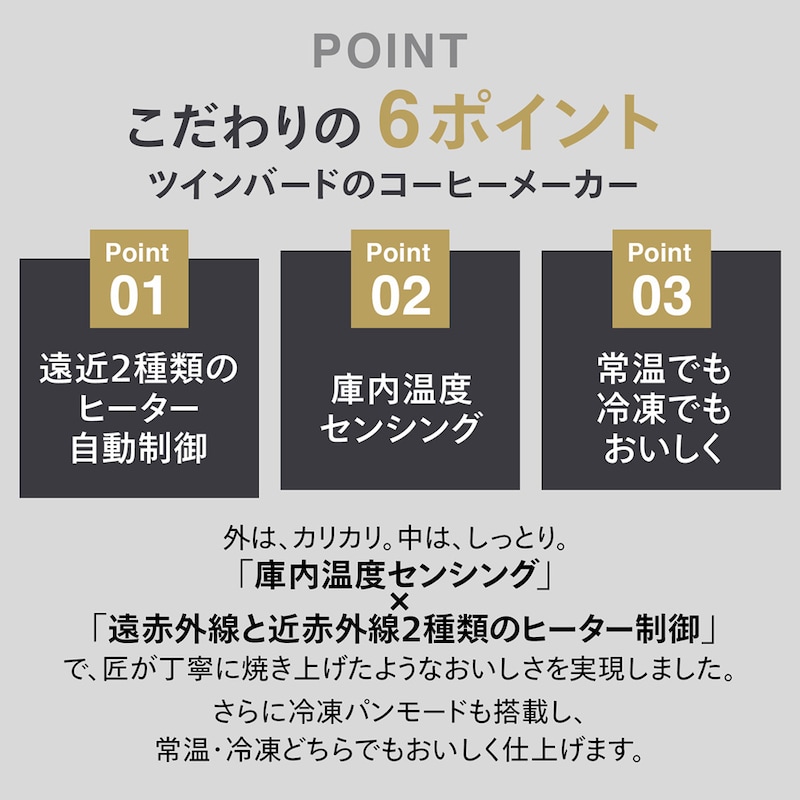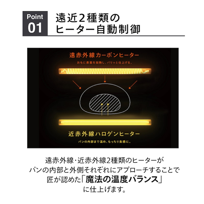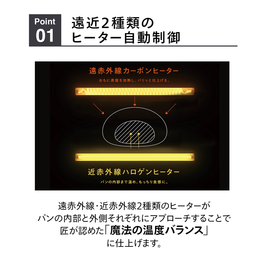遠赤外線・近赤外線2種類のヒーターがパンの内部と外側それぞれにアプローチをすることで、匠が認めた「魔法の温度バランス」に仕上げます
