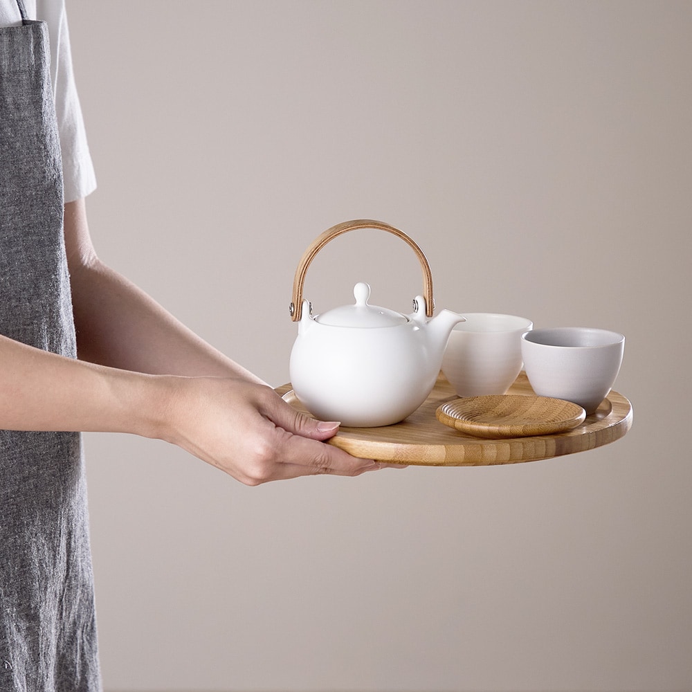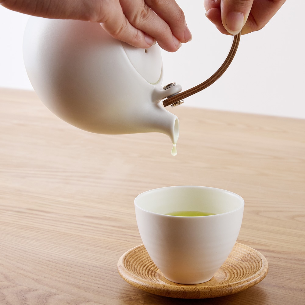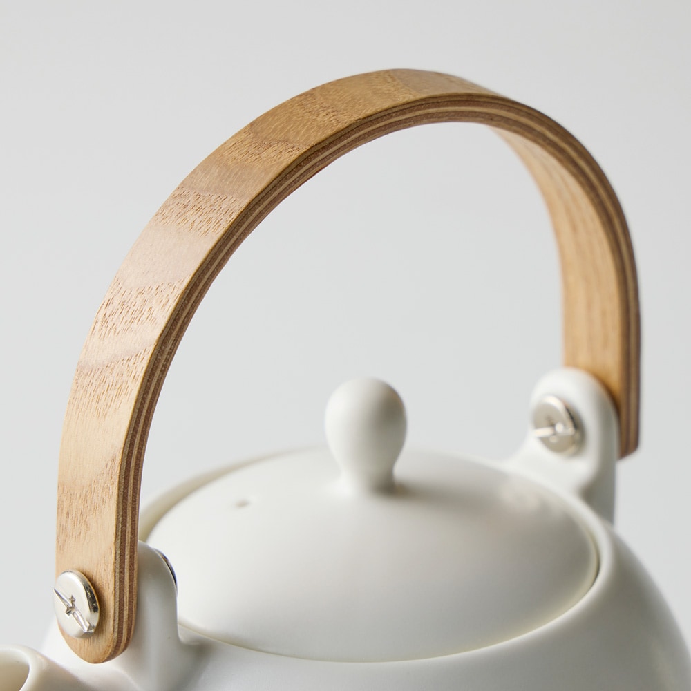 ●主材/土瓶急須:磁器、ハンドル:天然木(柳材)、茶こし:ステンレス 湯呑:磁器